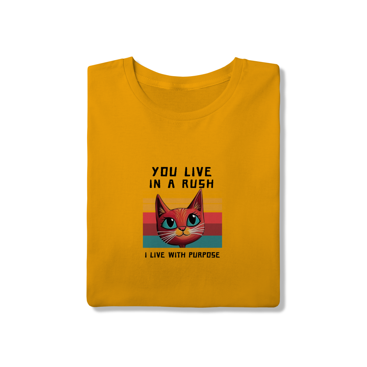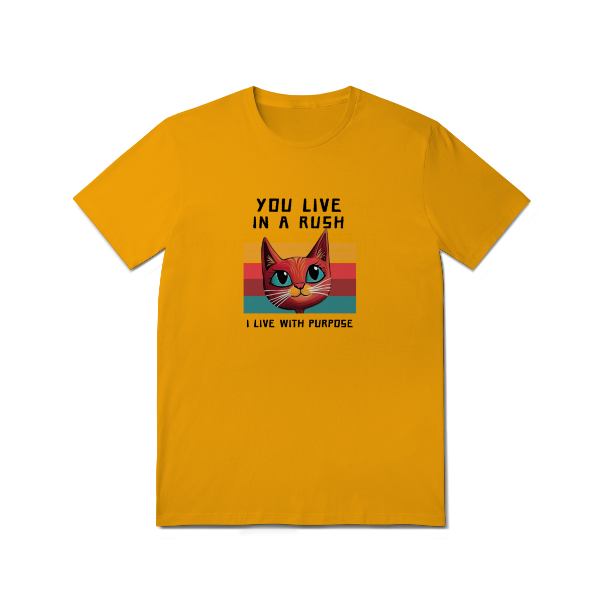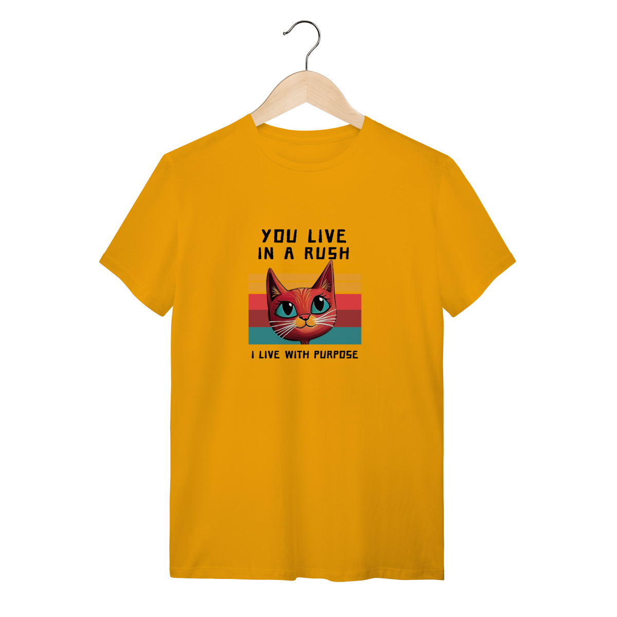Camiseta Amarelo Ouro, Camiseta Amarela, Gato Live With Purpose, Frase em Inglês, Estilo Retro, Slow Living, Algodão 30.1, Camiseta Unissex, Quality Premium, Cat Lover, Roupa Confortável