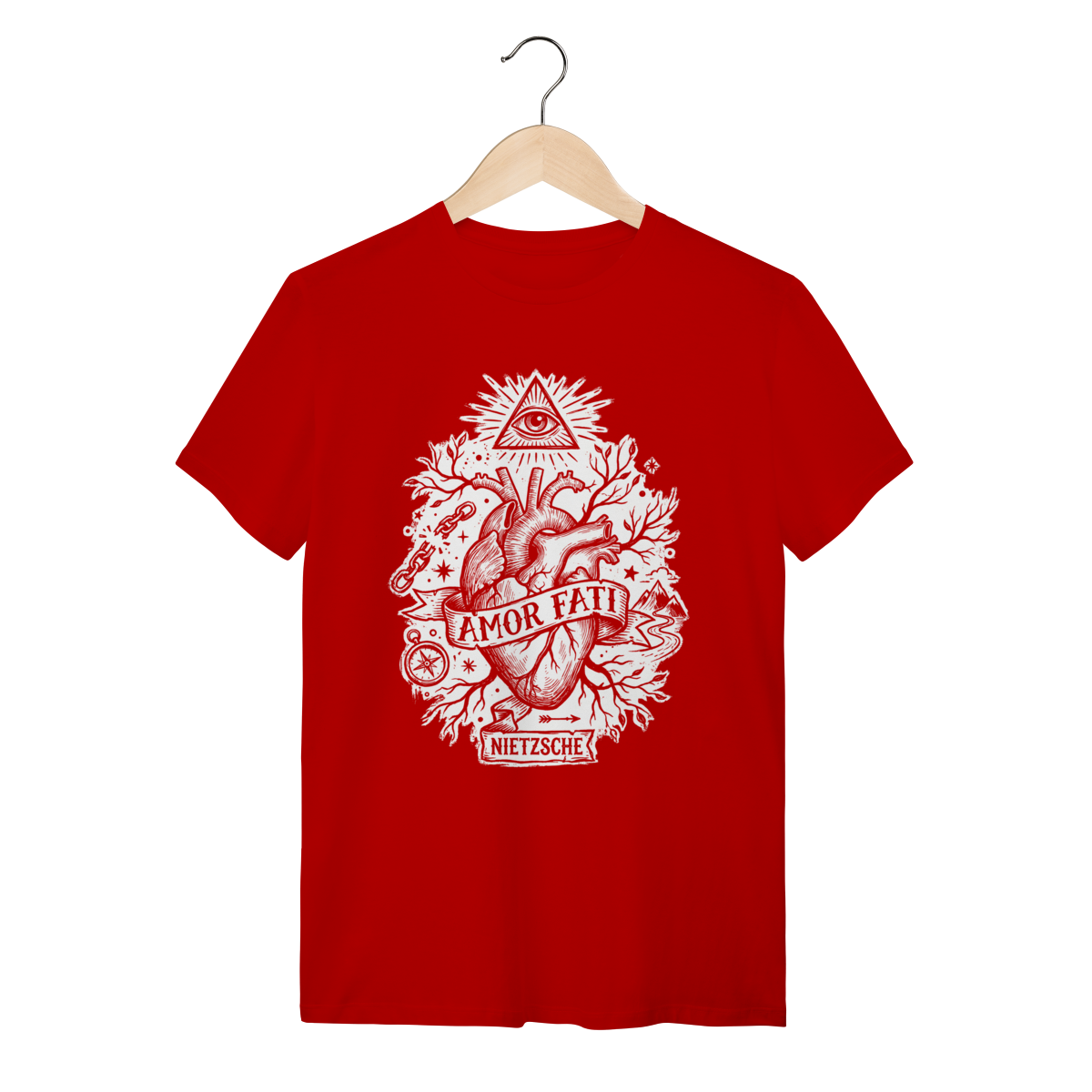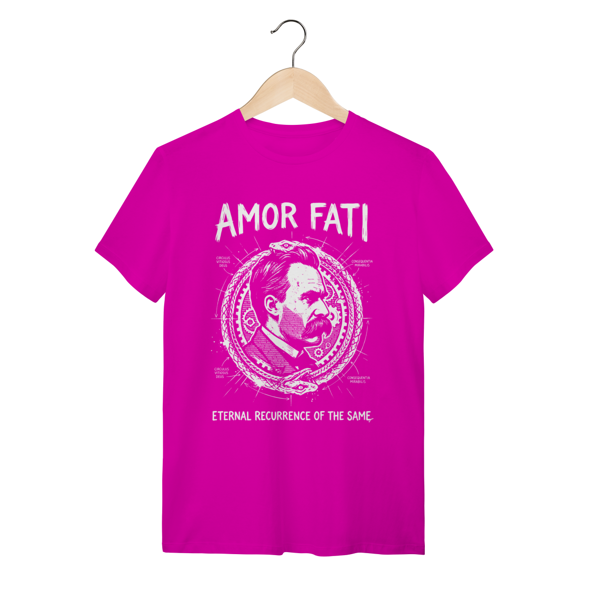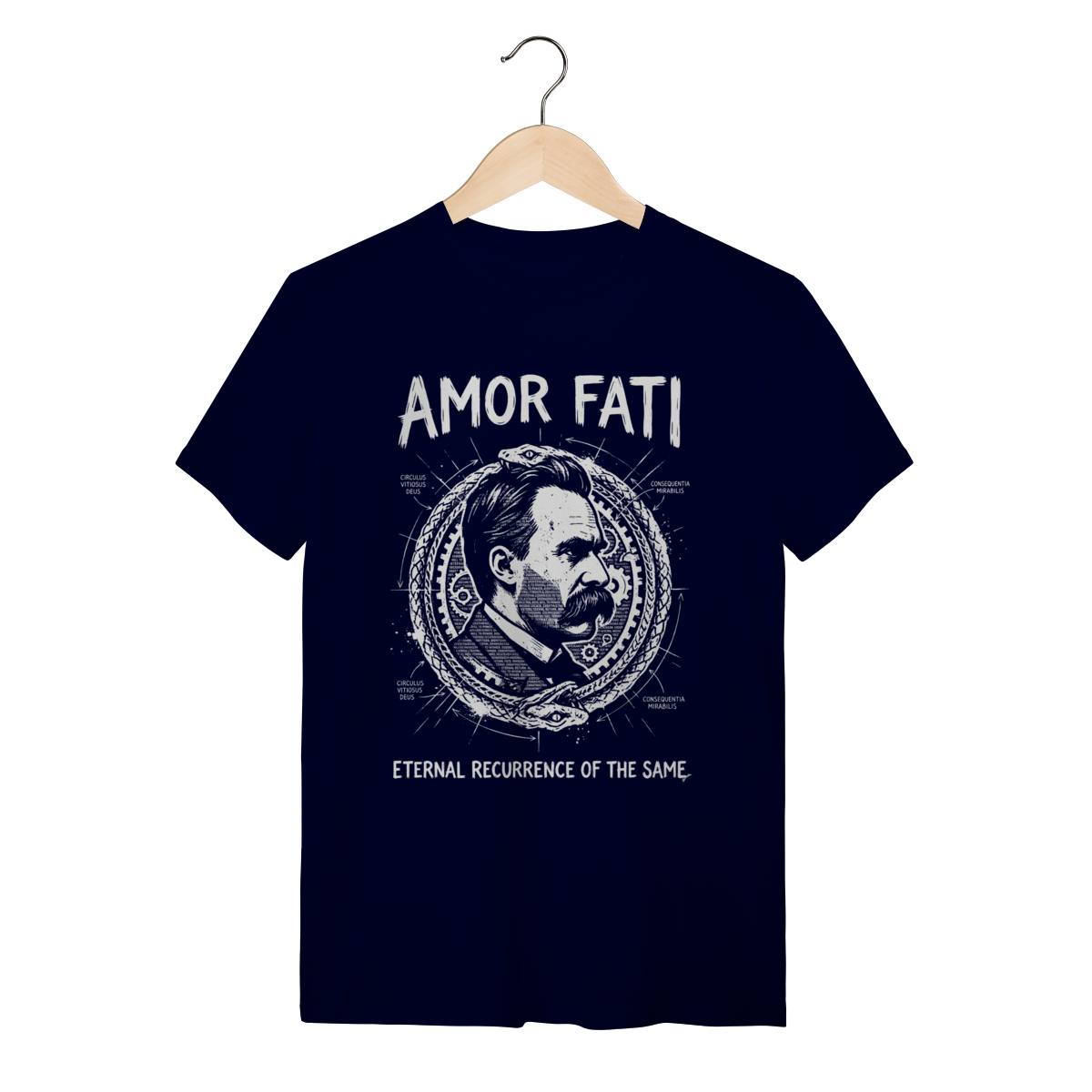"Amor Fati" não é resignação; é a celebração do caos e da ordem. É o desejo de que sua vida se repita exatamente como é, eternamente. Ao vestir esta peça, você sinaliza intelectualidade, resiliência e uma compreensão profunda da existência. Você se separa da multidão comum e se conecta com a elite pensante que entende que o sofrimento e a alegria são combustíveis iguais para a grandeza. É mais que uma estampa, é o seu manifesto de "Vontade de Potência".