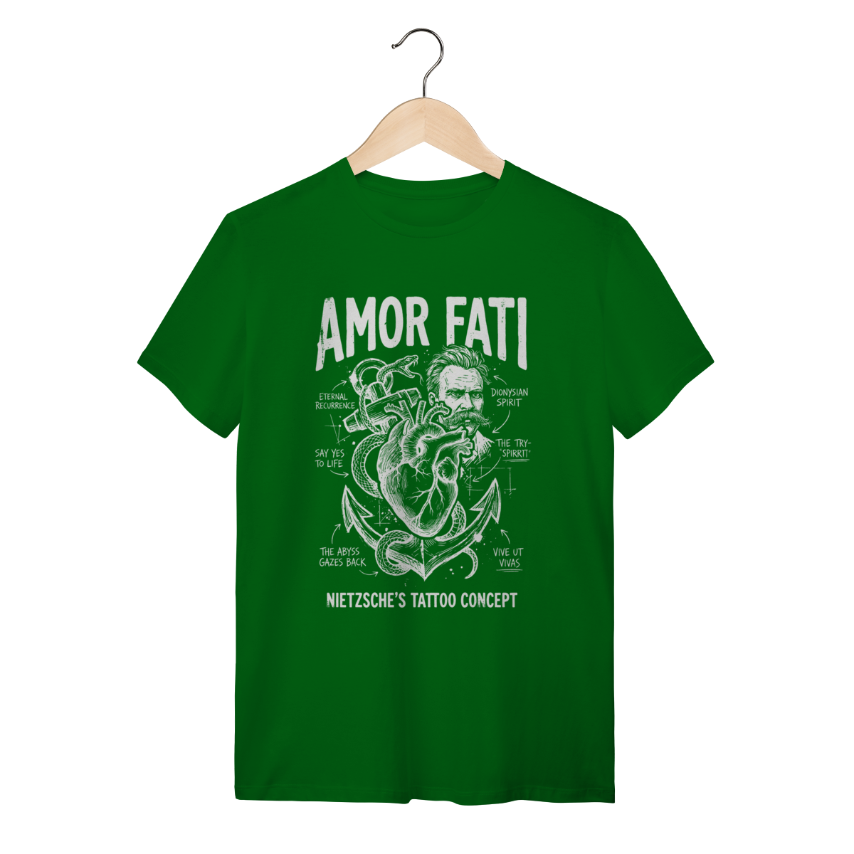 A estampa apresenta uma estética de gravura clássica e anotações científicas (estilo blueprint intelectual). O design central exibe referências profundas: o Ouroboros (a serpente que engole a própria cauda representando o Eterno Retorno) cercando a figura de Nietzsche ou o coração anatômico pulsante, entrelaçados com geometria sagrada e tipografia rústica. O visual grunge e monocromático confere um ar de sabedoria atemporal, transformando conceitos filosóficos densos em uma obra de arte vestível e impactante.
