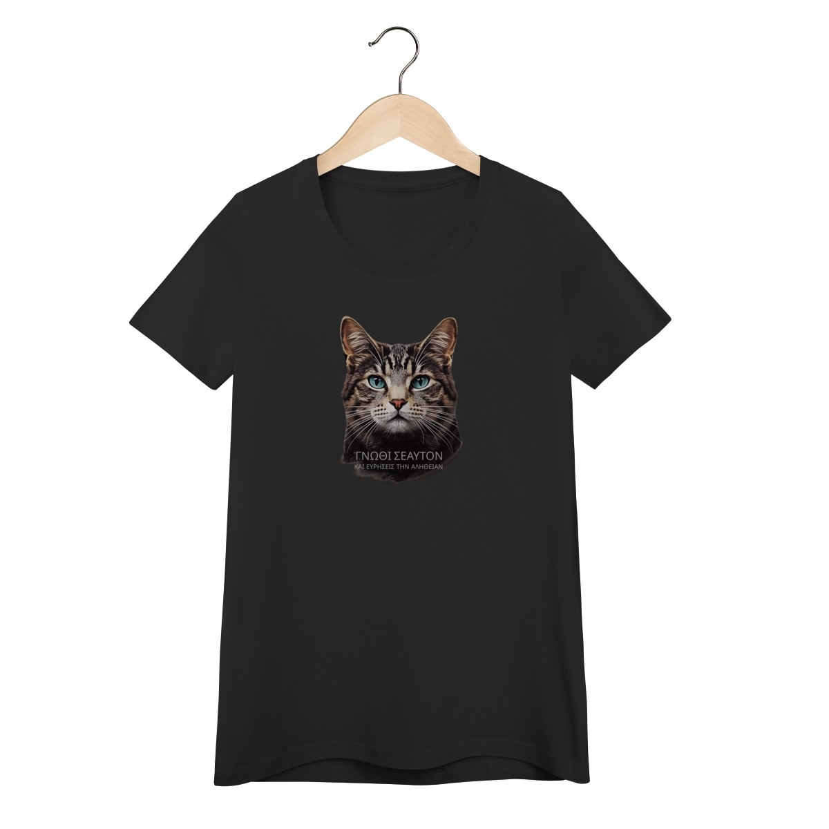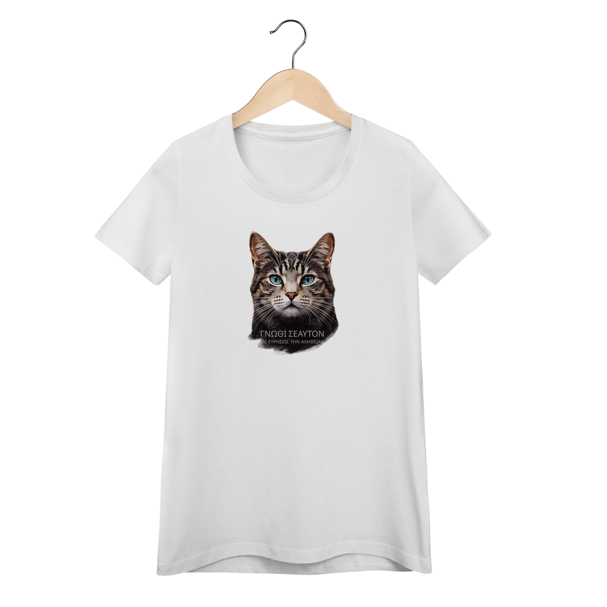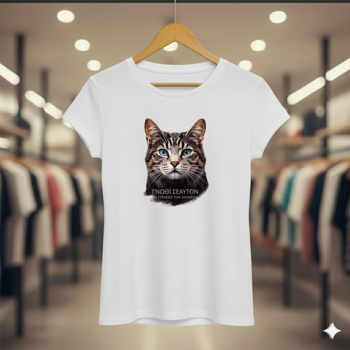 Conceito: Estampa inspirada na filosofia grega, com o texto "ΓΝΩΘΙ ΣΕΑΥΤΟΝ" (Conhece-te a ti mesmo), a máxima inscrita no Templo de Apolo em Delfos. O olhar penetrante do gato Tabby representa a busca pela verdade interior.