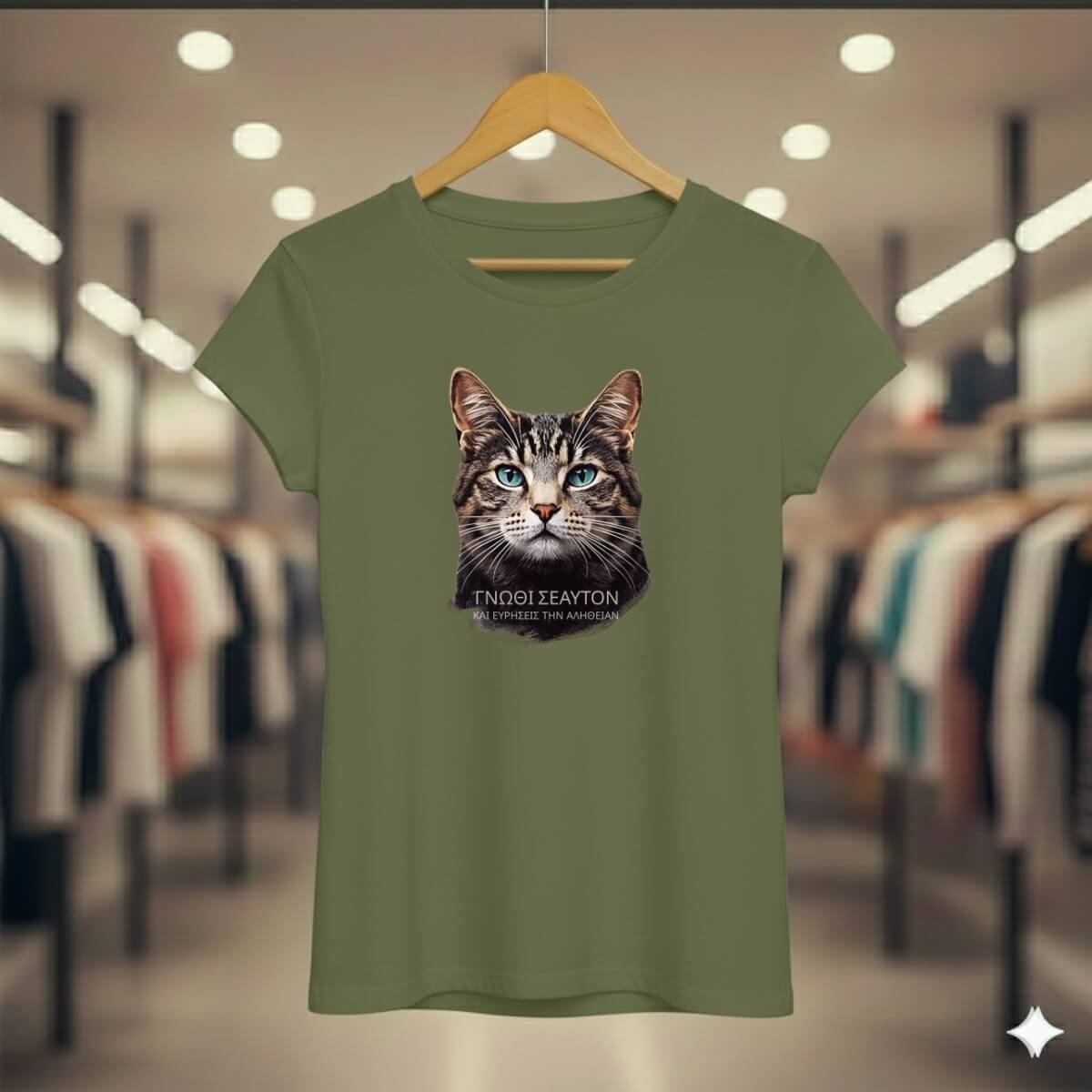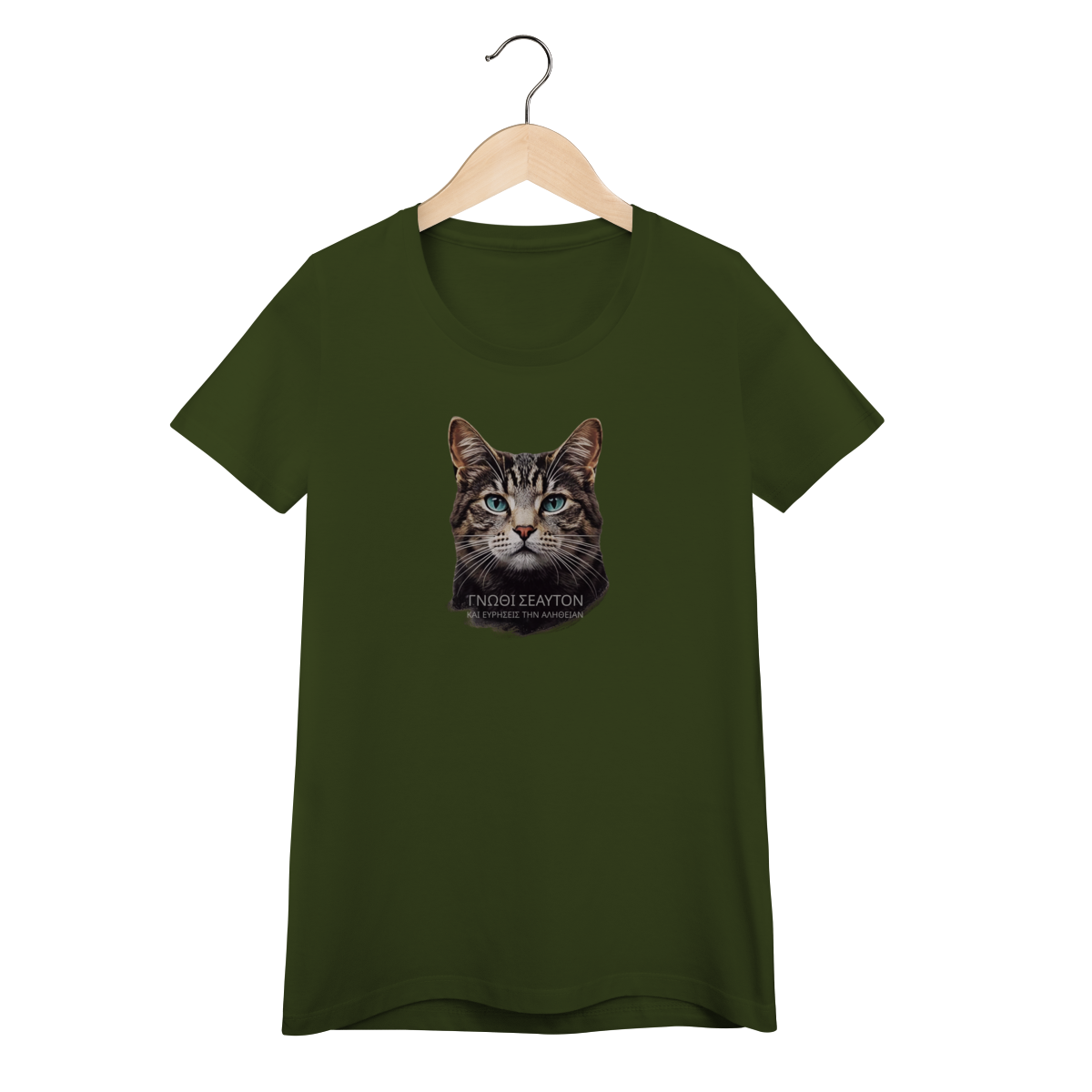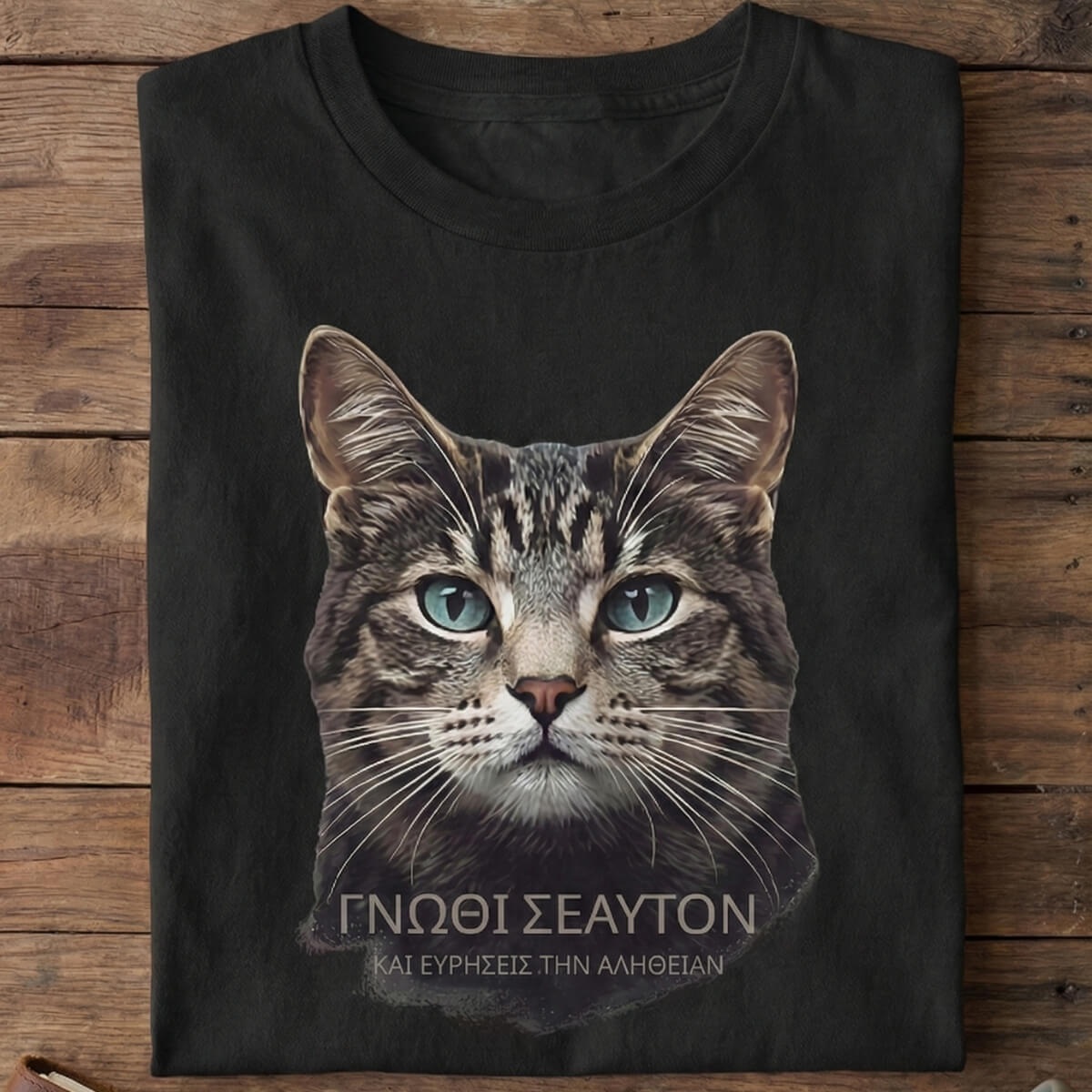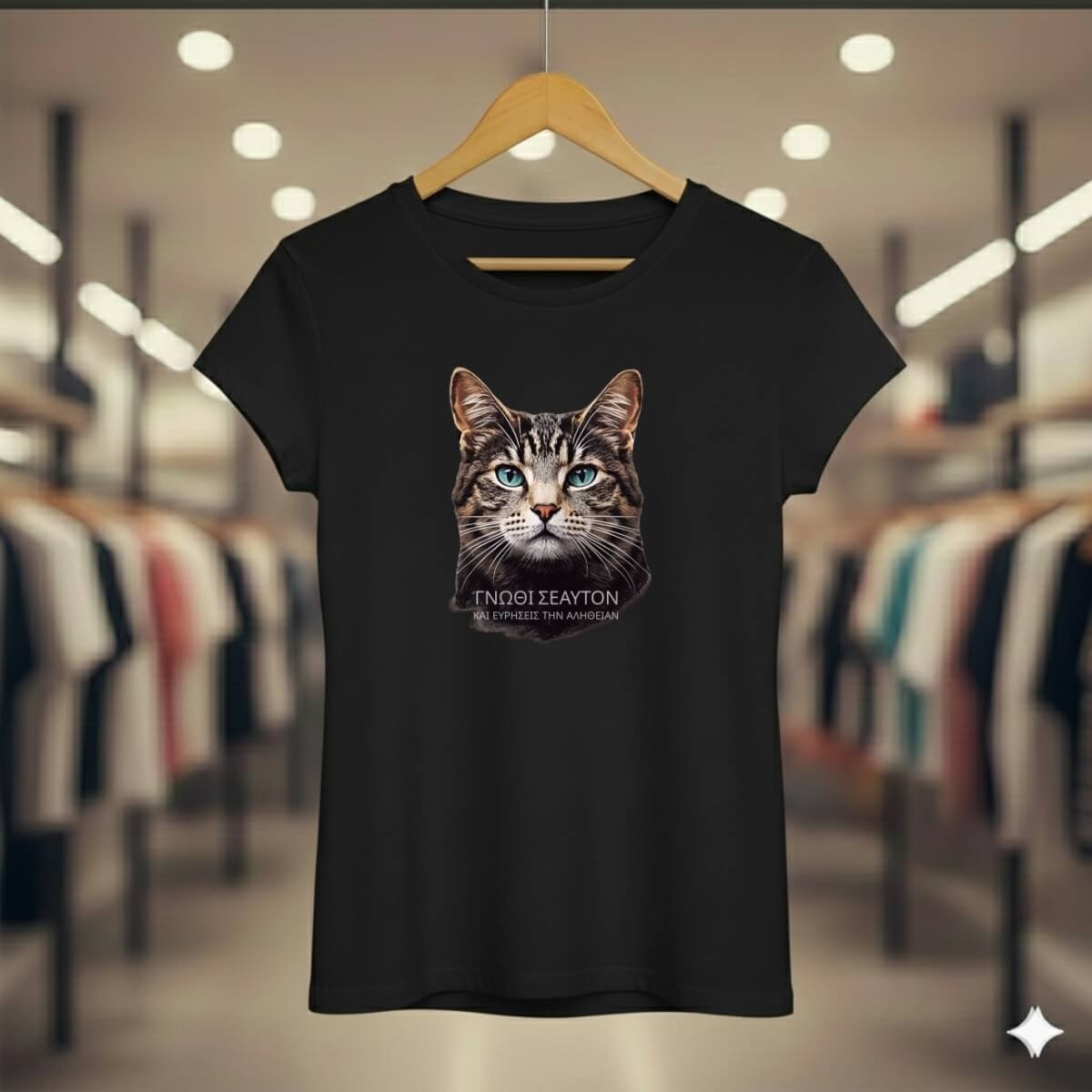 Conceito: Estampa inspirada na filosofia grega, com o texto "ΓΝΩΘΙ ΣΕΑΥΤΟΝ" (Conhece-te a ti mesmo), a máxima inscrita no Templo de Apolo em Delfos. O olhar penetrante do gato Tabby representa a busca pela verdade interior.