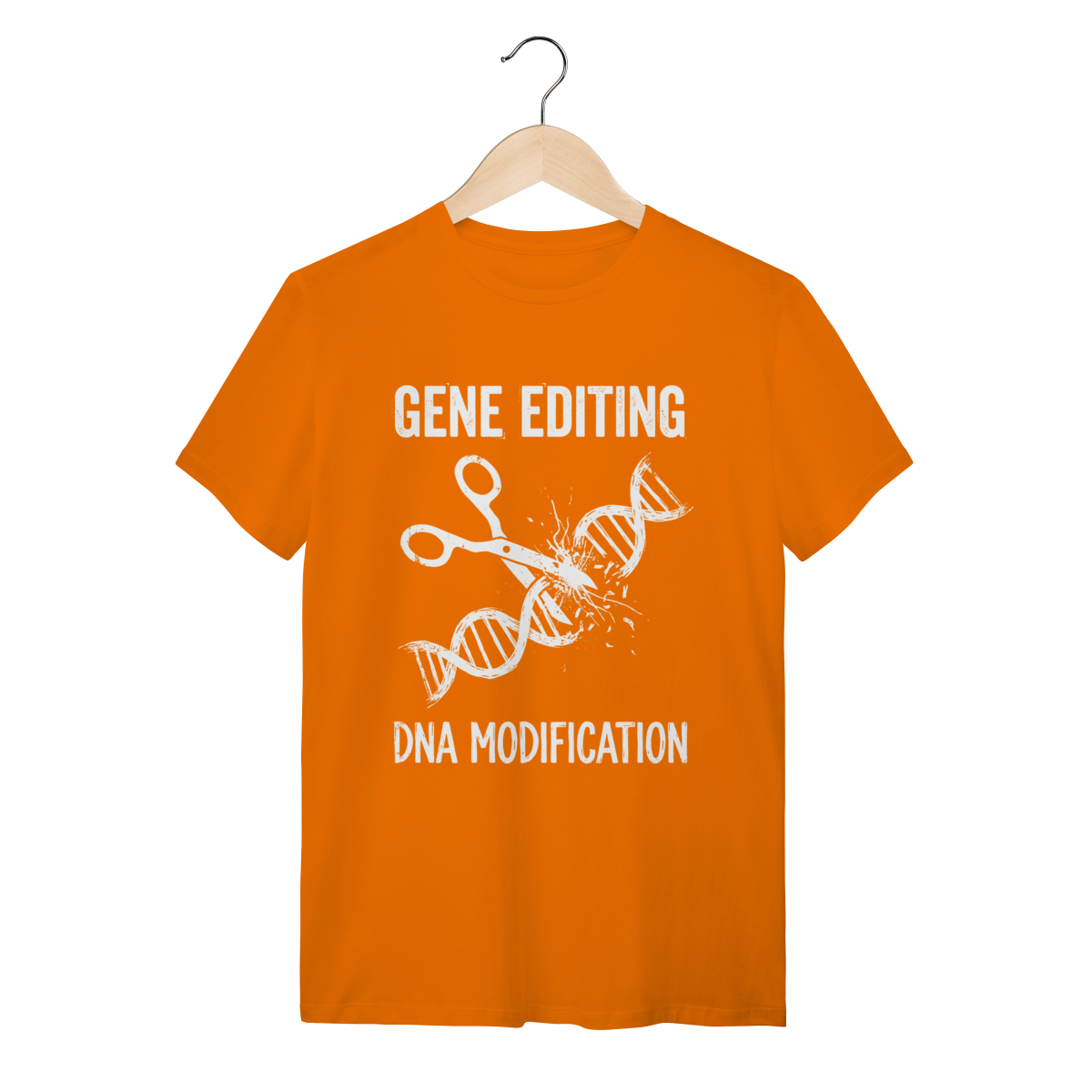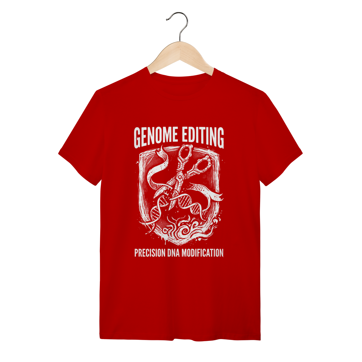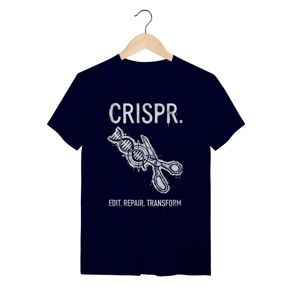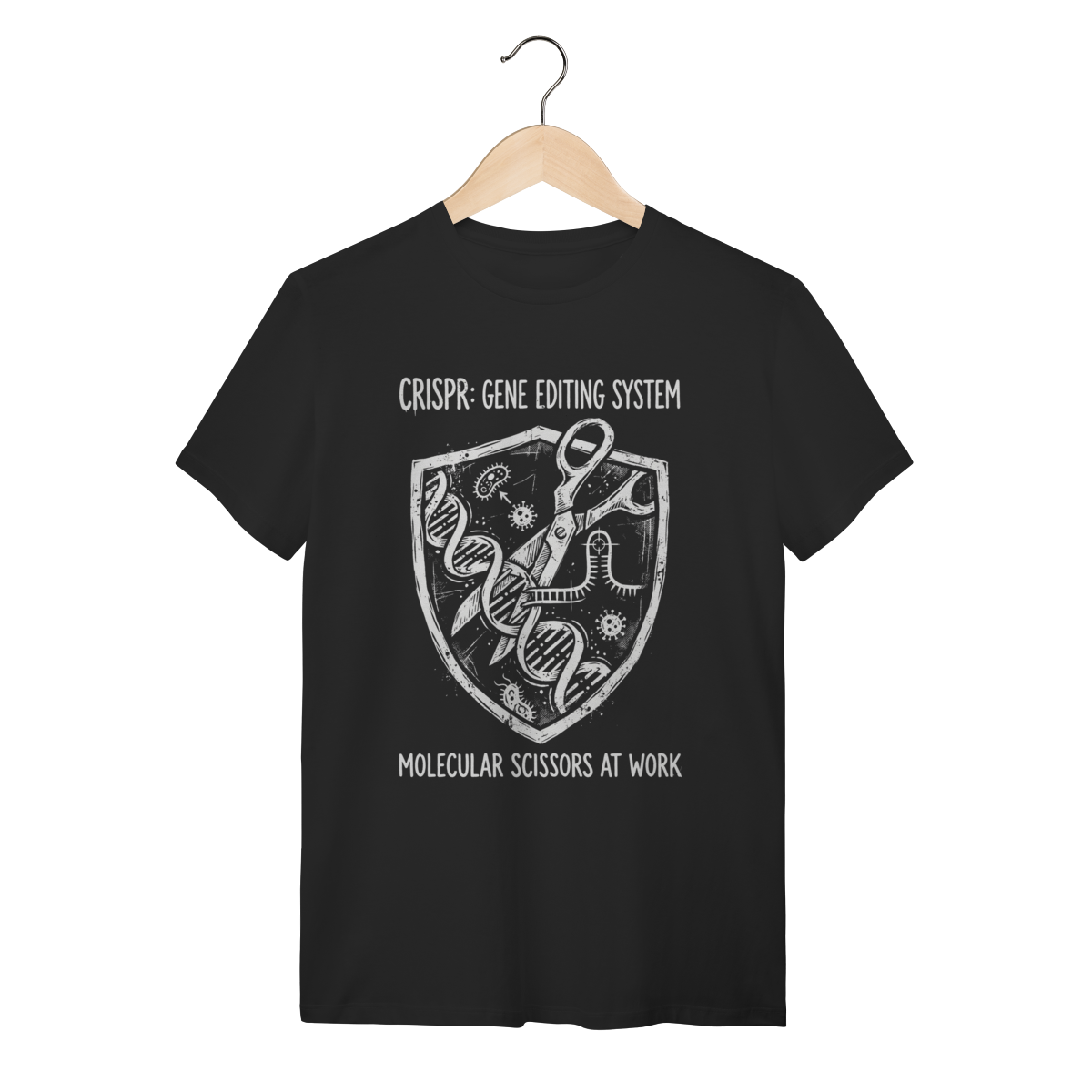 A estampa traz uma representação artística e impactante da "tesoura molecular" em ação, seccionando a dupla hélice do DNA com precisão cirúrgica. O design aposta em um estilo grunge desgastado, remetendo a diagramas técnicos clássicos, mas com uma pegada urbana e contemporânea. Os traços detalhados das fitas de DNA e a tipografia robusta criam um visual que une o laboratório ao streetwear com maestria.
