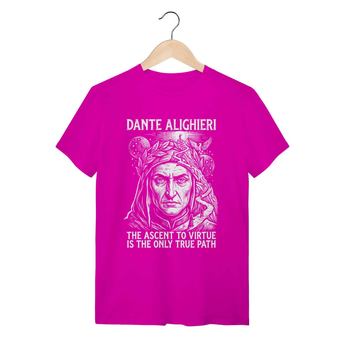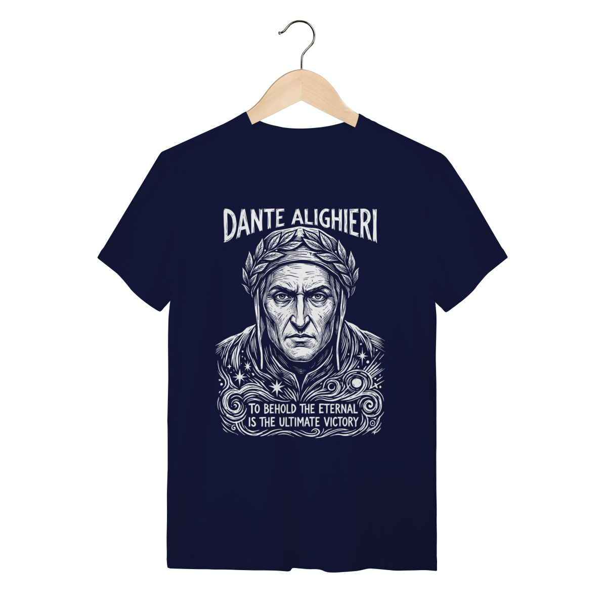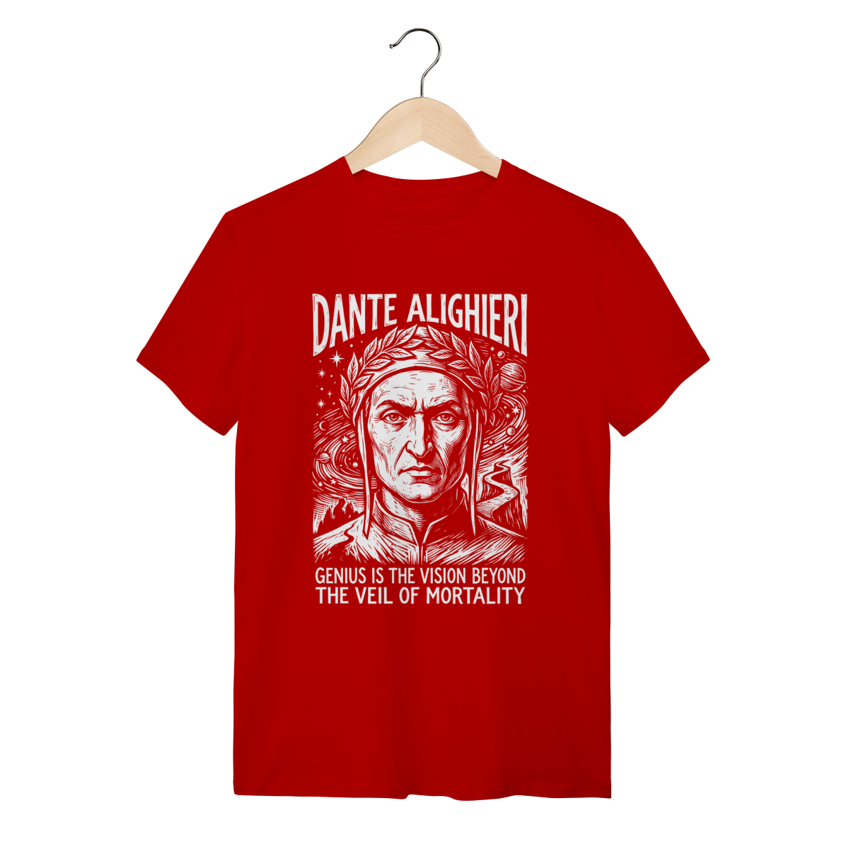 Camiseta básica, estampa frontal, centralizada de: Dante Alighieri, o sumo poeta italiano cuja obra-prima A Divina Comédia mapeou a jornada da alma humana através do inferno, purgatório e paraíso, fundando as bases da língua e cultura moderna.