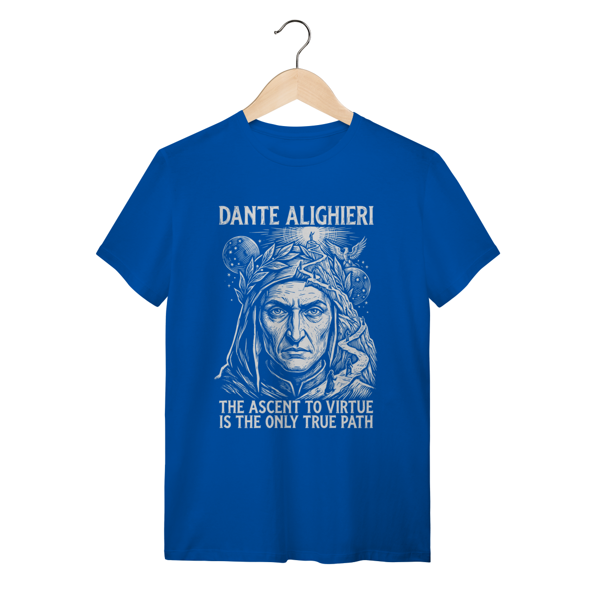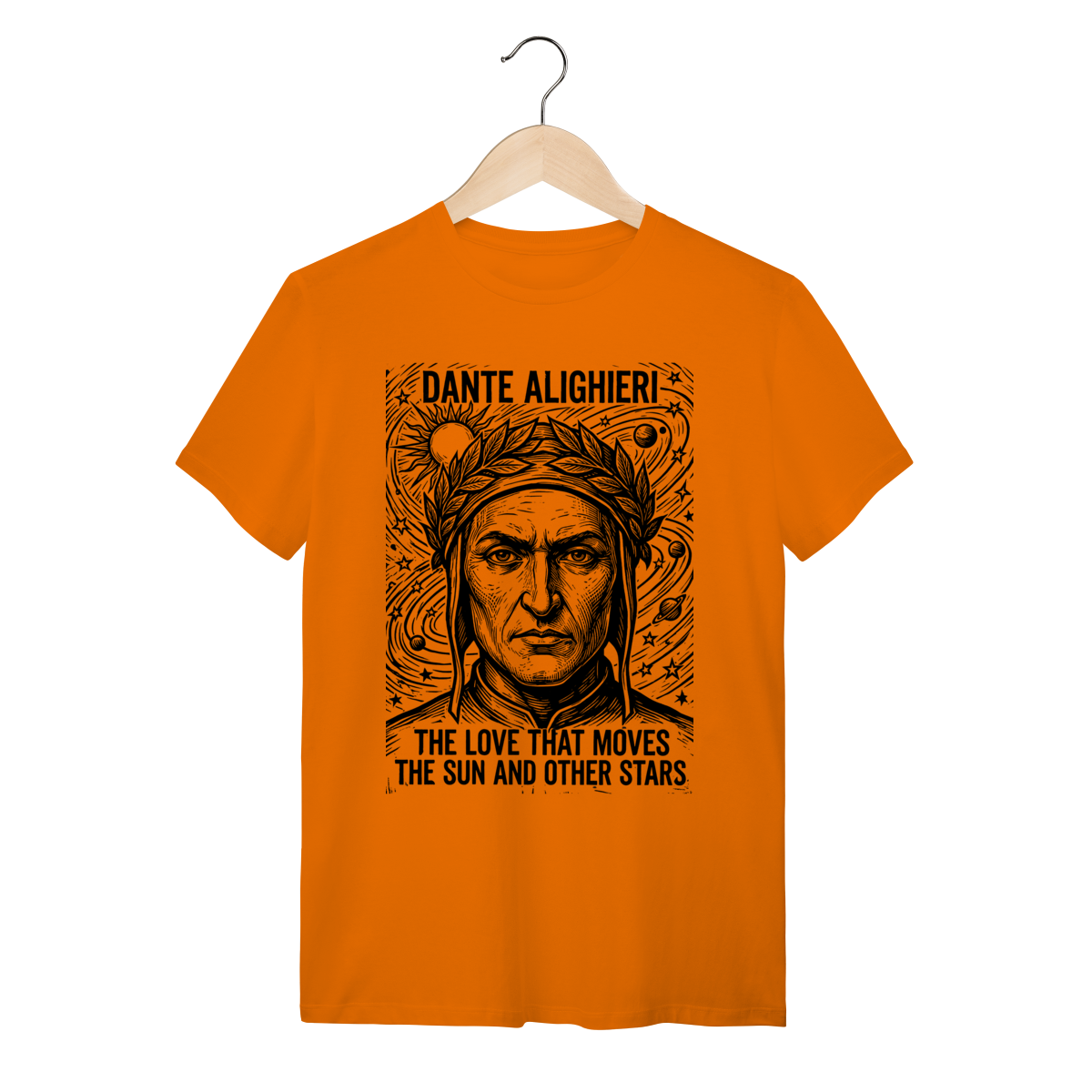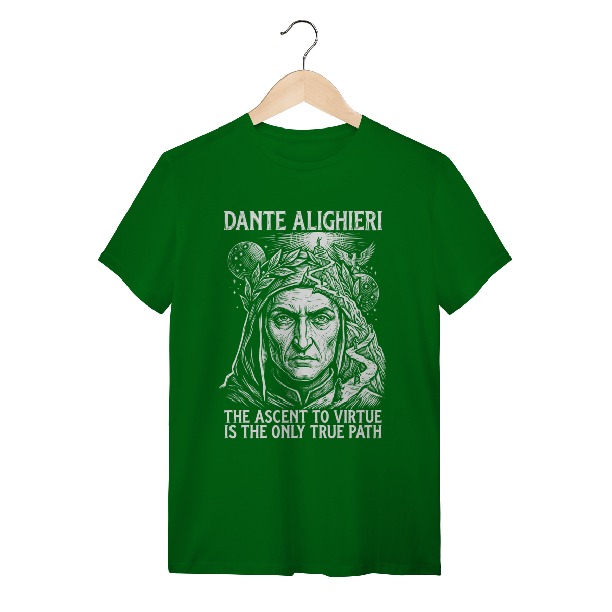 Camiseta básica, estampa frontal, centralizada de: Dante Alighieri, o sumo poeta italiano cuja obra-prima A Divina Comédia mapeou a jornada da alma humana através do inferno, purgatório e paraíso, fundando as bases da língua e cultura moderna.