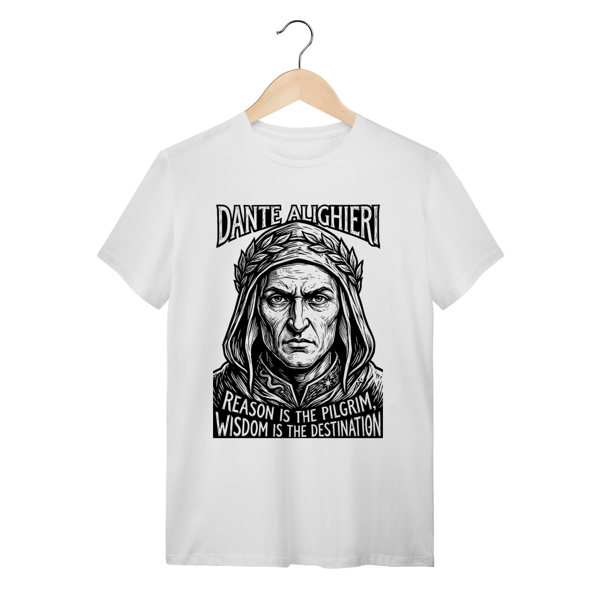 Camiseta Branca: Retrato de Dante com coroa de louros em estilo linocut e a tipografia REASON IS THE PILGRIM, WISDOM IS THE DESTINATION.