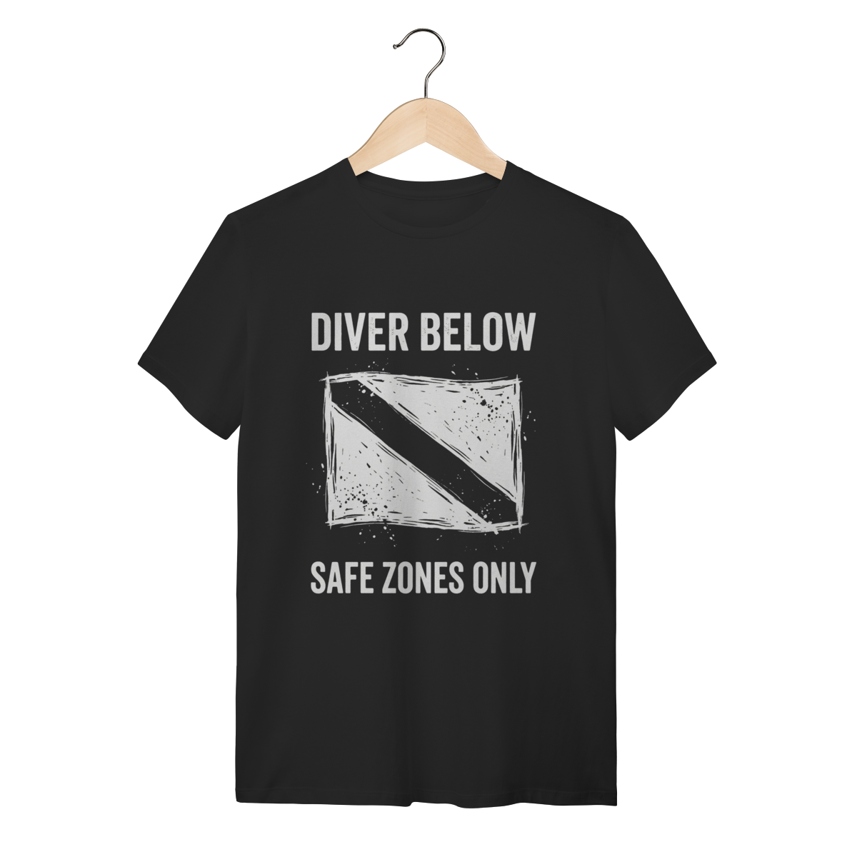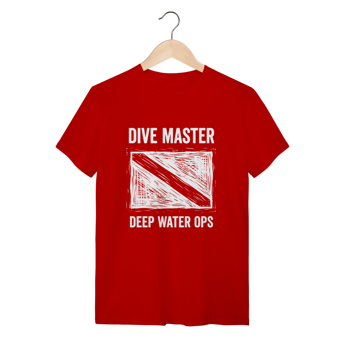 A estampa apresenta a clássica bandeira vermelha com a faixa diagonal branca, estilizada com um efeito "grunge" e desgastado que remete à aventura e à resistência do sal. As fontes robustas e texturizadas ("Diver Below", "Deep Water Ops") reforçam a identidade de quem encara as profundezas com seriedade e estilo. O contraste das cores foi pensado para destacar o orgulho de ser mergulhador.