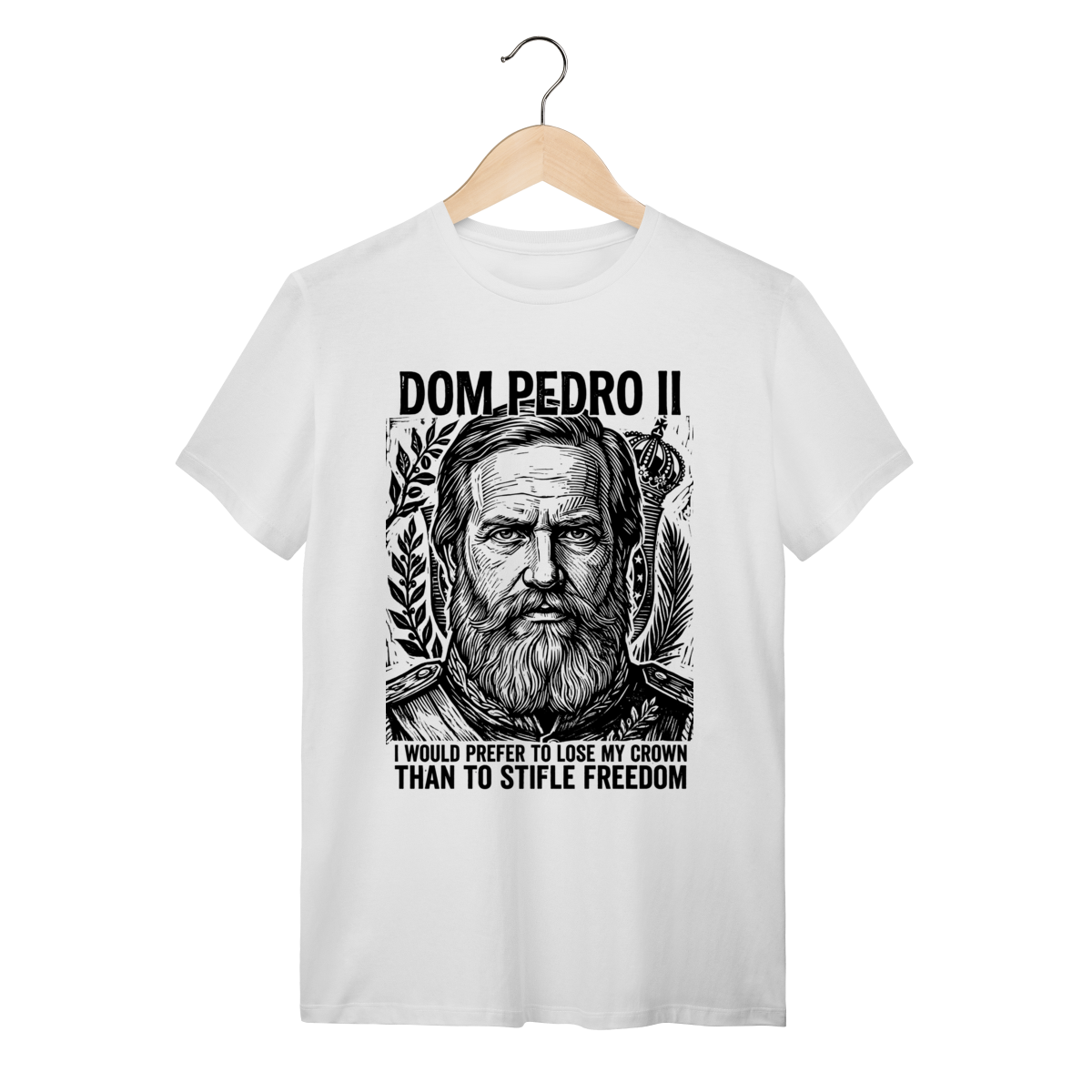 Camiseta básica, estampa frontal, centralizada de: Dom Pedro II, o Magnânimo, segundo e último monarca do Império do Brasil, reconhecido por seu profundo intelecto, patrocínio às artes e ciências, e dedicação ao progresso, governando com um senso inabalável de dever e justiça.