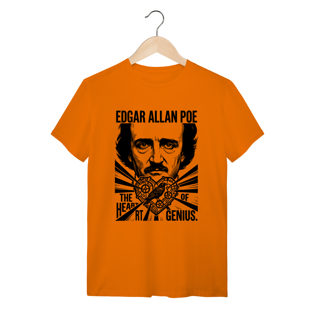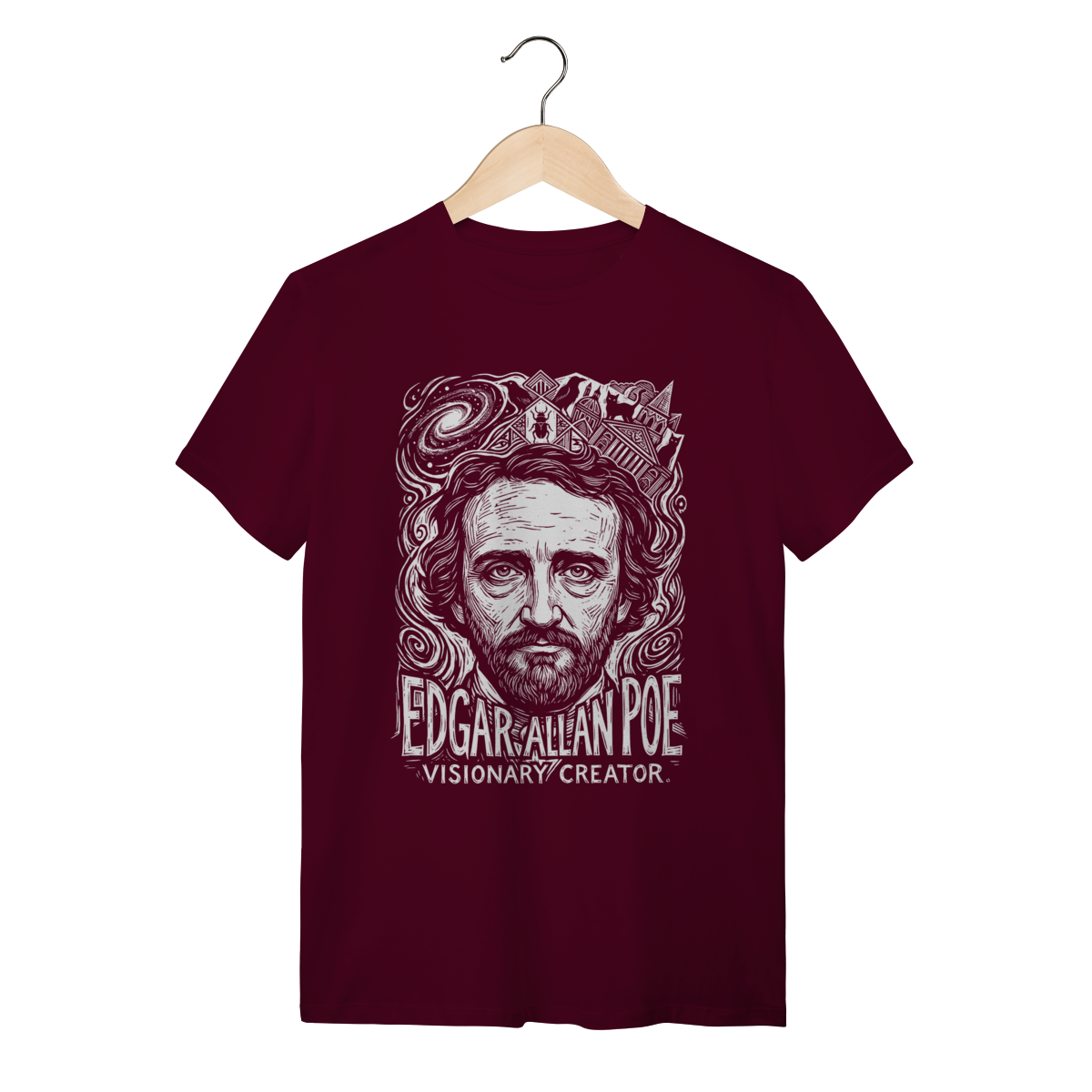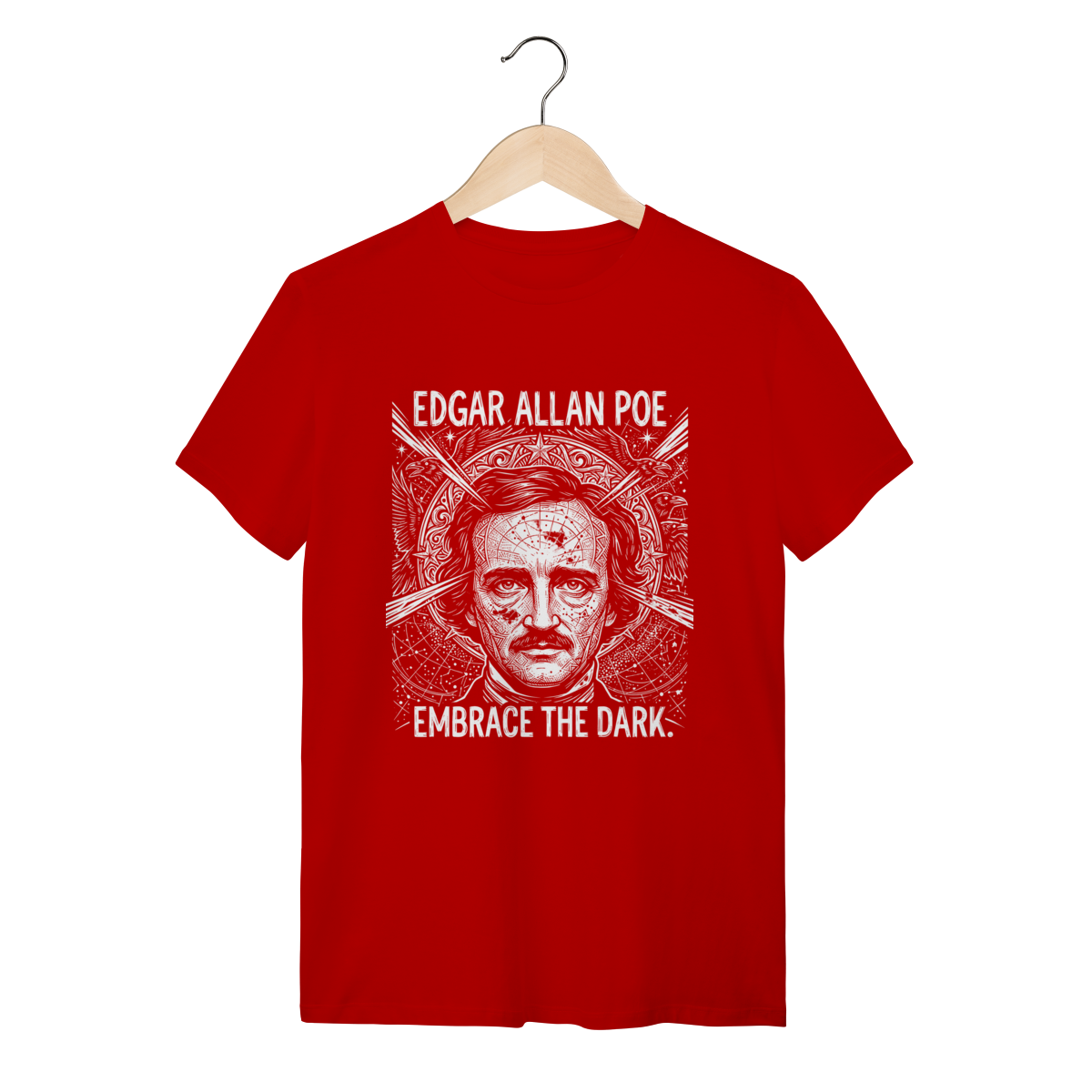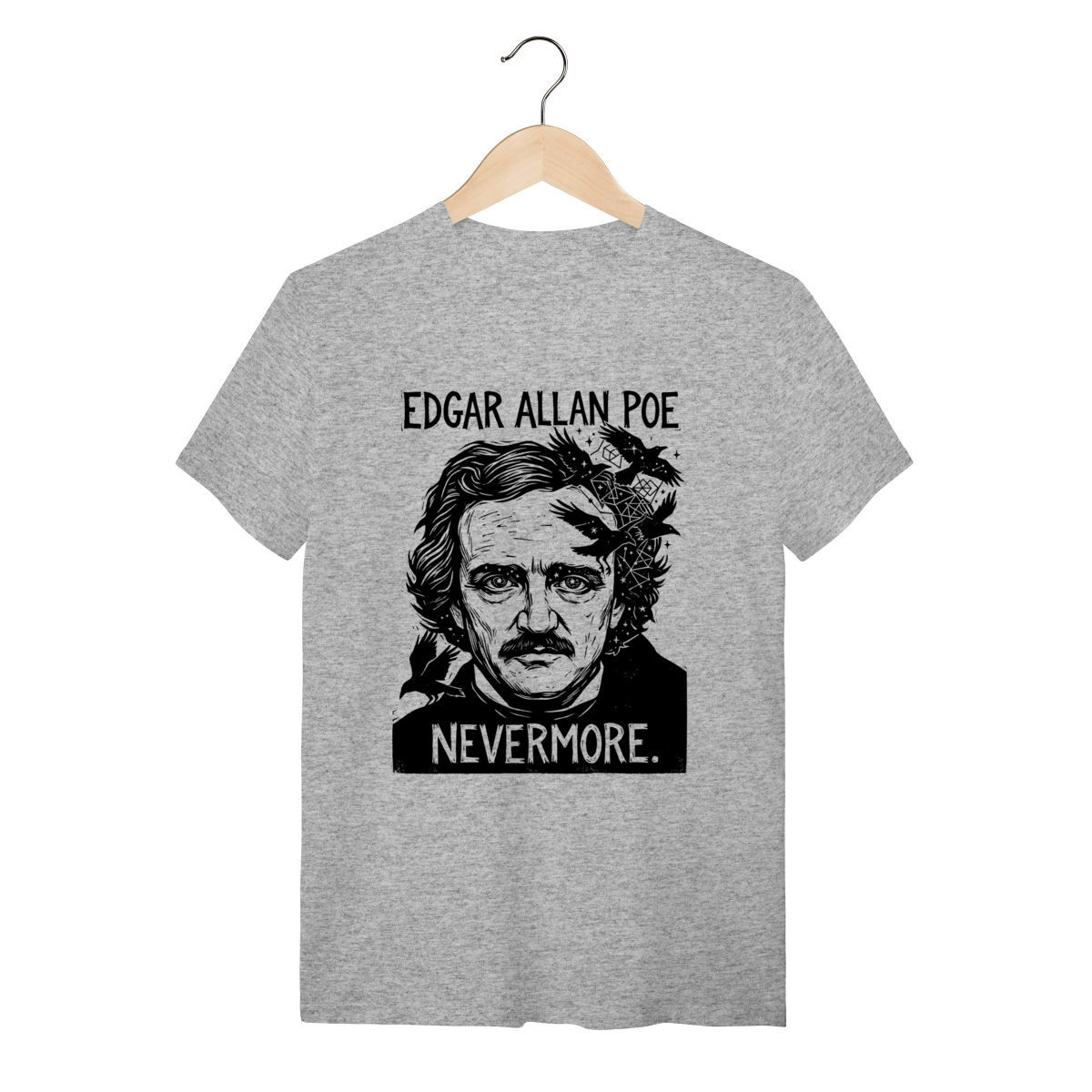 Camiseta básica, estampa frontal, centralizada de: Edgar Allan Poe, o mestre supremo do macabro e pioneiro dos contos de mistério, cujas obras poéticas e sombrias mergulham nas mais profundas emoções, pavores e genialidades da mente humana.
