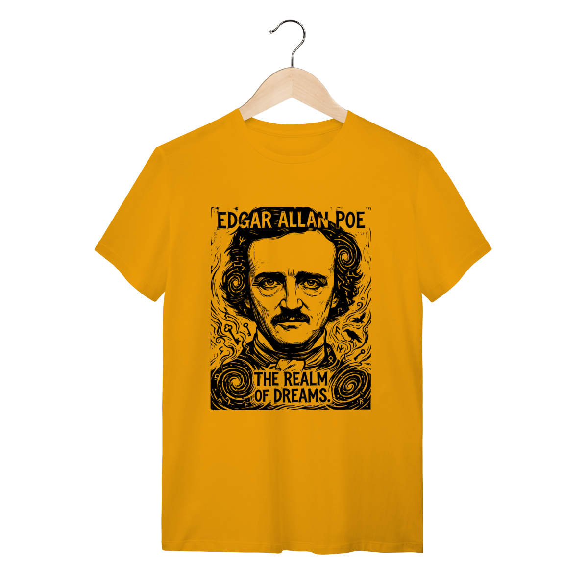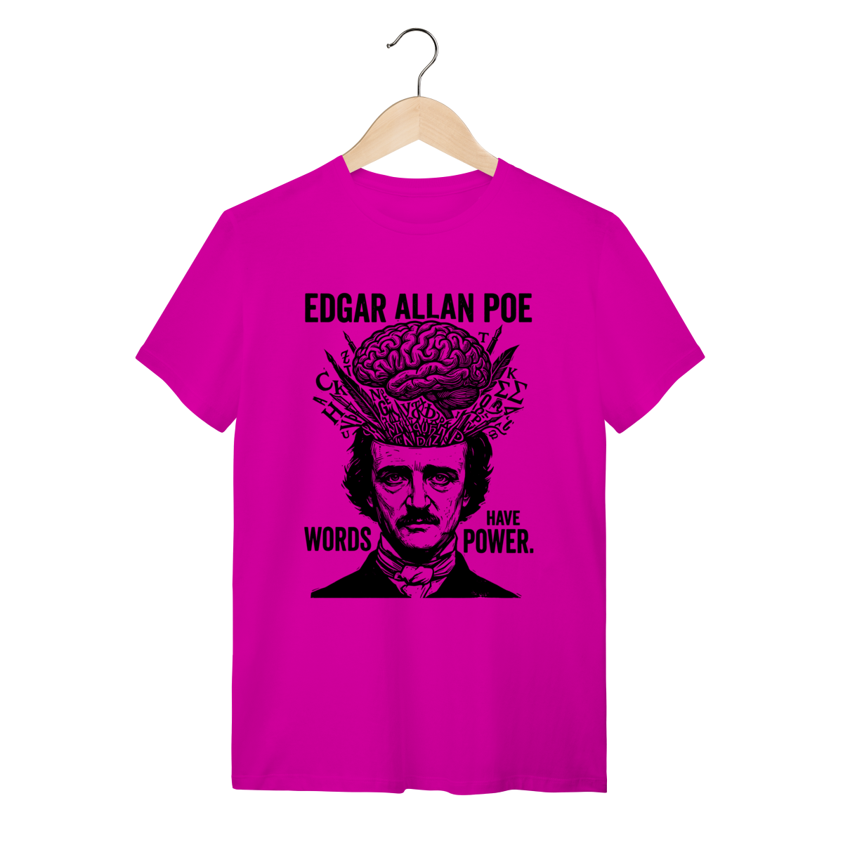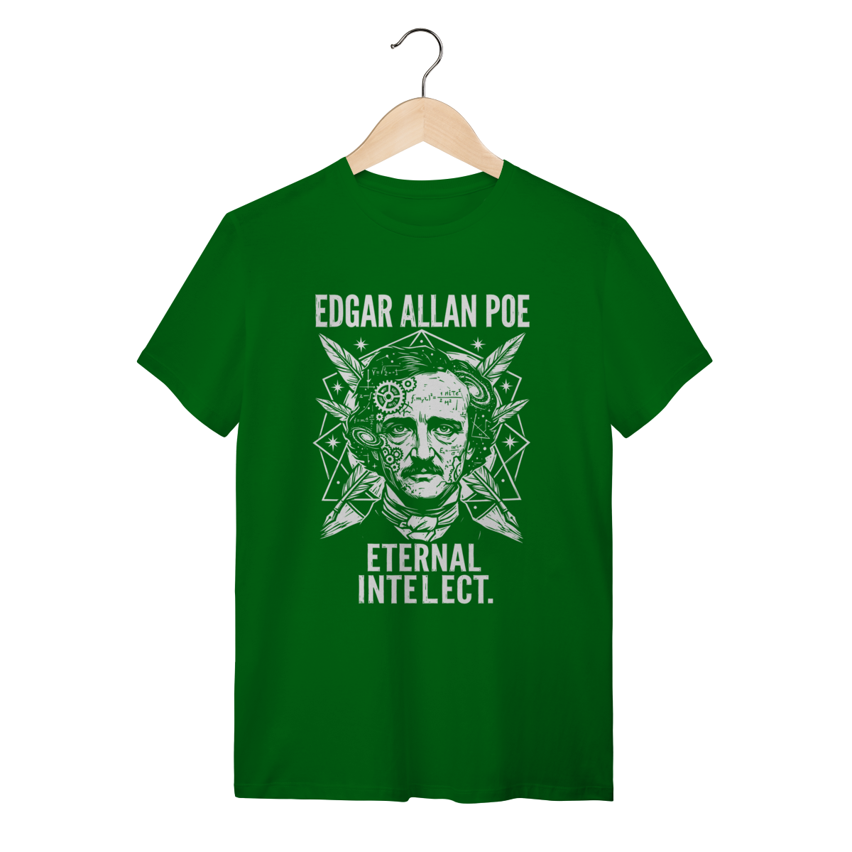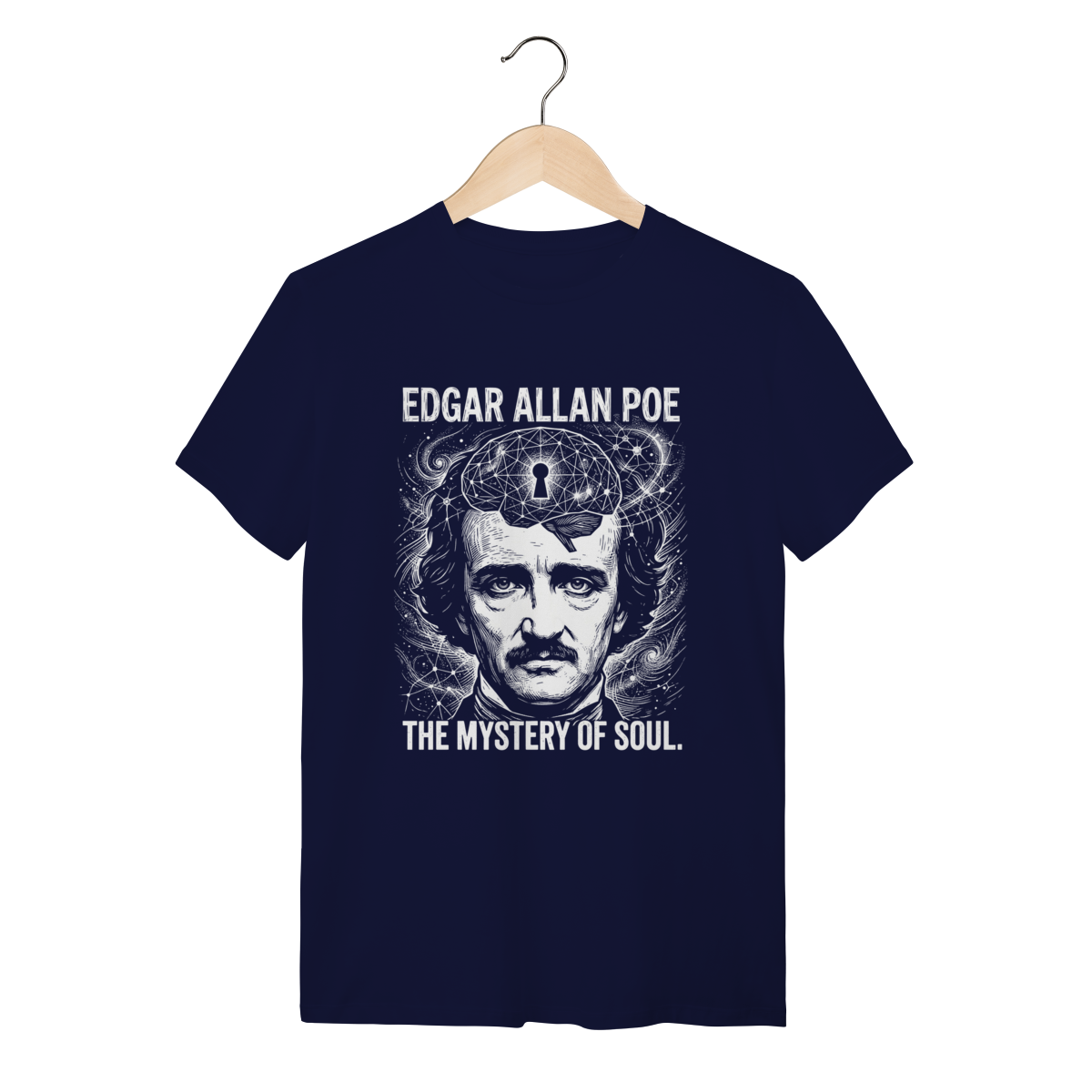 Camiseta básica, estampa frontal, centralizada de: Edgar Allan Poe, o mestre supremo do macabro e pioneiro dos contos de mistério, cujas obras poéticas e sombrias mergulham nas mais profundas emoções, pavores e genialidades da mente humana.