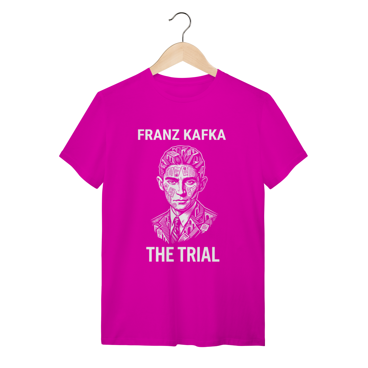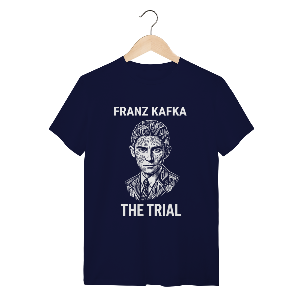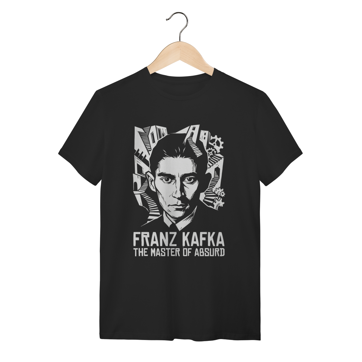 Esta estampa é a definição visual da angústia moderna. Inspirada no profeta do absurdo, a arte da capa (Preto) captura a essência de Franz Kafka: o retrato em alto contraste, austero e penetrante, do homem que previu a burocracia sufocante e a alienação do século XX. Ao vestir esta peça, você não veste apenas um autor; você veste a lucidez de quem enxerga as engrenagens invisíveis do mundo.
