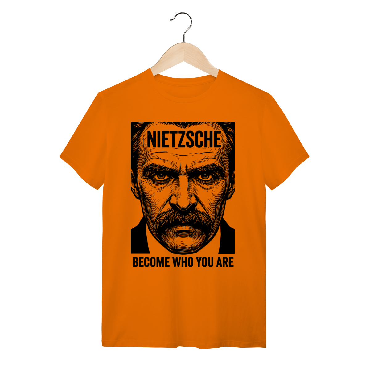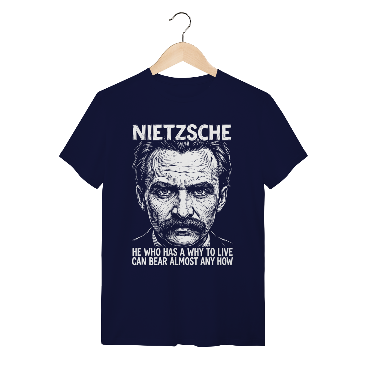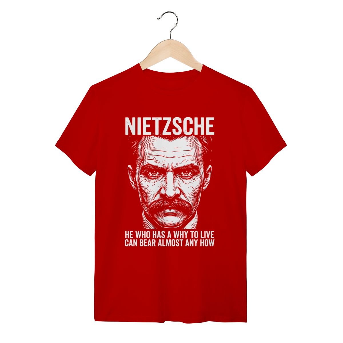 Camiseta básica, estampa frontal, centralizada de: Friedrich Nietzsche, um dos mais influentes e provocativos filósofos da era moderna, cujas ideias revolucionárias sobre o niilismo, a "vontade de poder" e o "além-do-homem" (Übermensch) desconstruíram a moralidade e abalaram as fundações do pensamento ocidental.