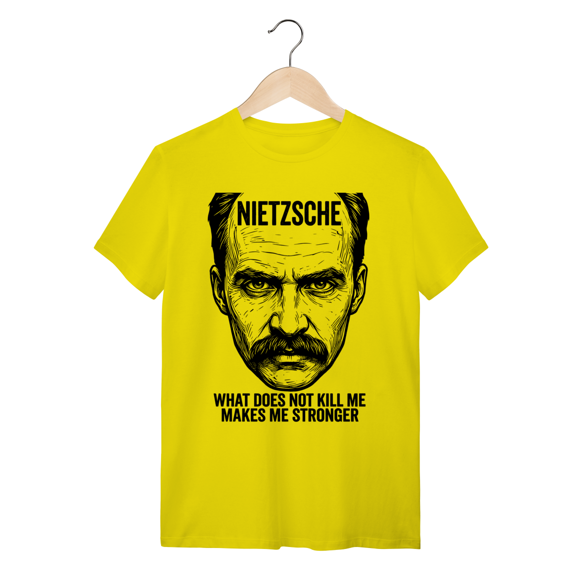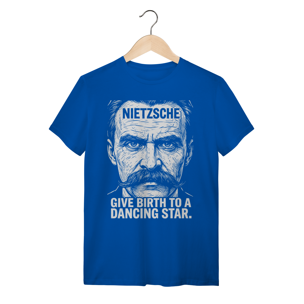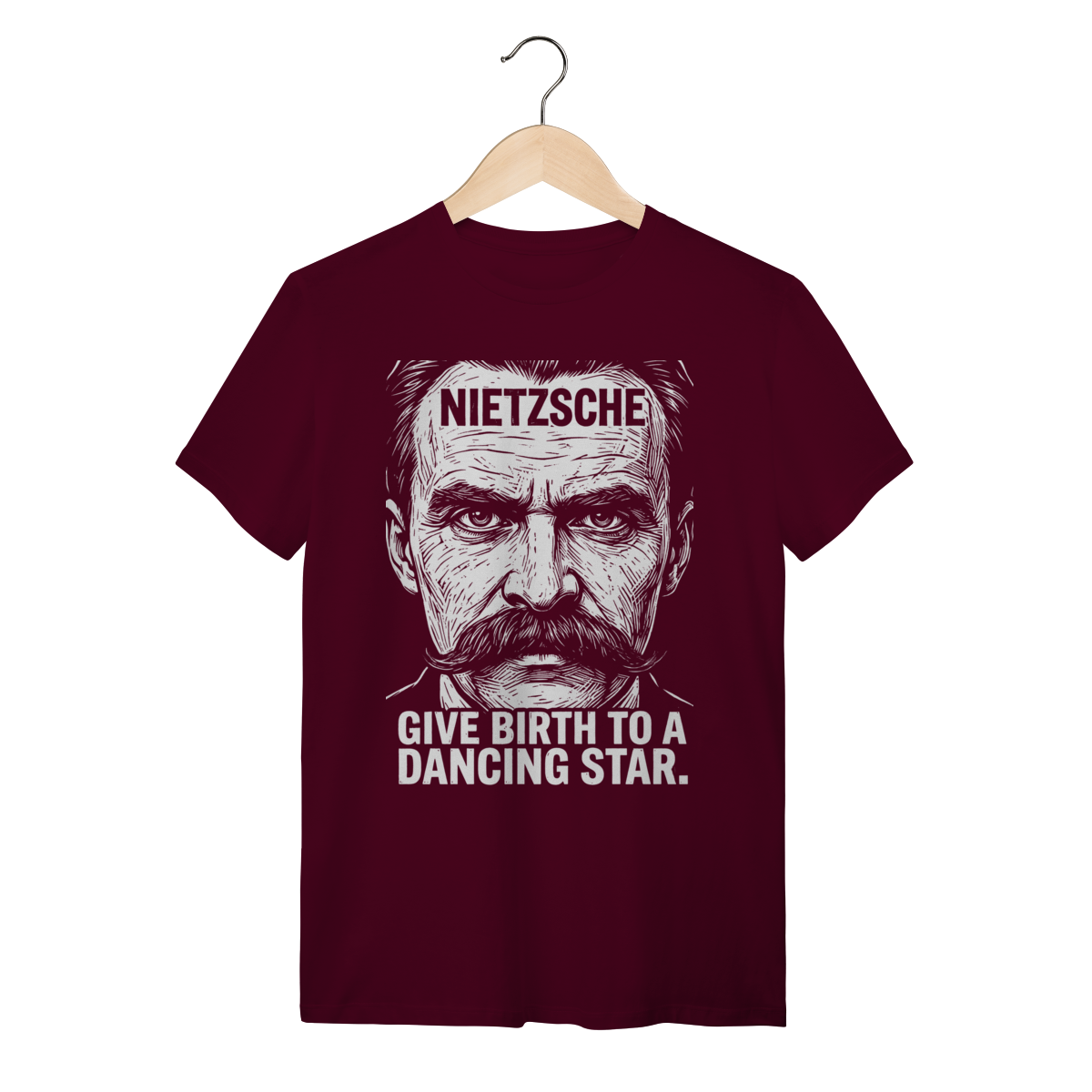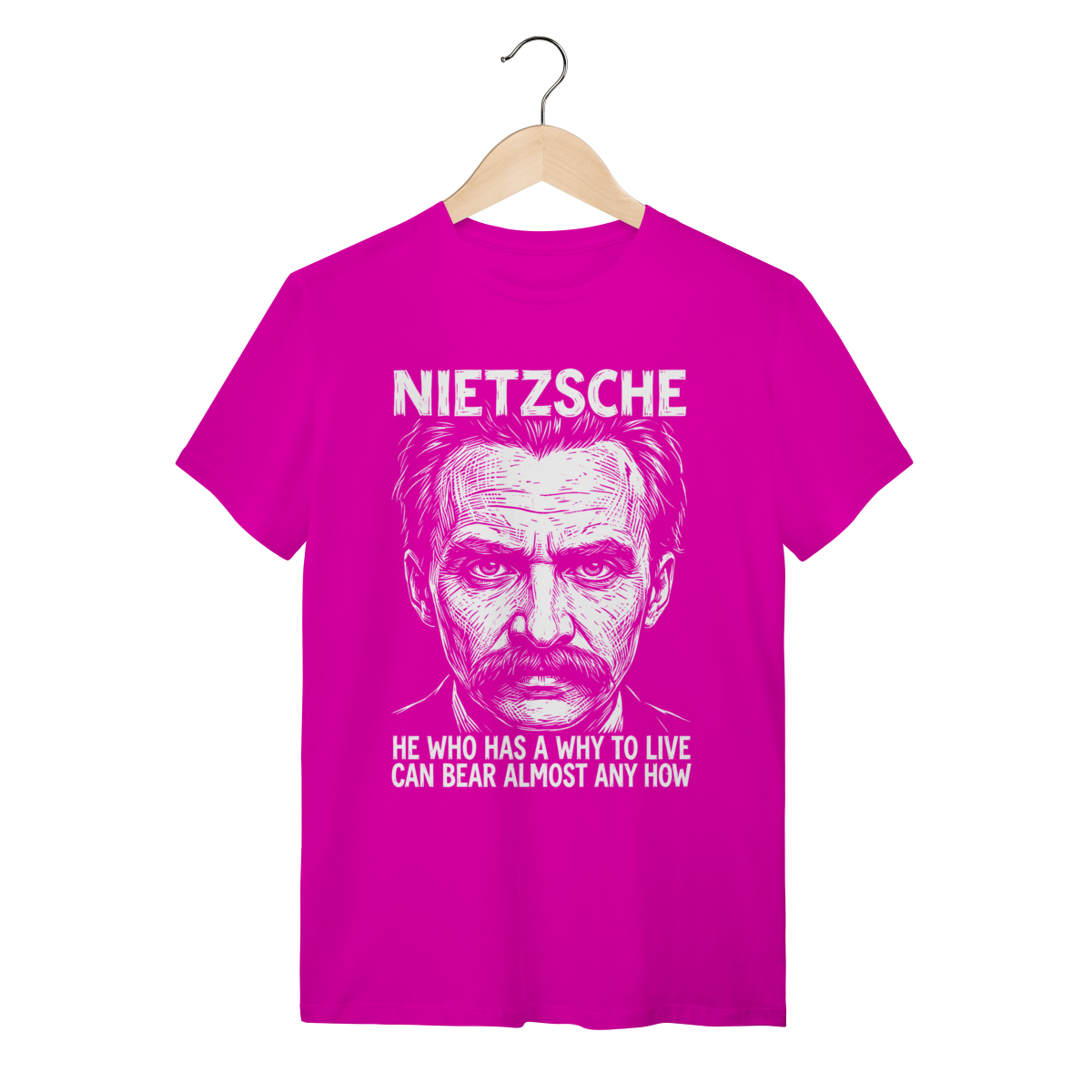Camiseta básica, estampa frontal, centralizada de: Friedrich Nietzsche, um dos mais influentes e provocativos filósofos da era moderna, cujas ideias revolucionárias sobre o niilismo, a "vontade de poder" e o "além-do-homem" (Übermensch) desconstruíram a moralidade e abalaram as fundações do pensamento ocidental.