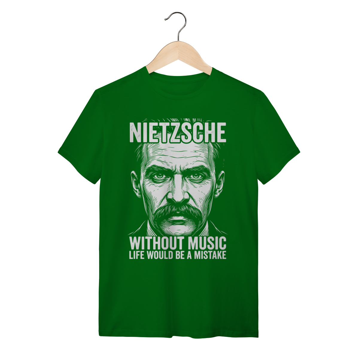 Camiseta Preta: Retrato estilizado de Friedrich Nietzsche de alto contraste, acompanhado da sua profunda reflexão existencial sobre a arte e a vida: "WITHOUT MUSIC LIFE WOULD BE A MISTAKE".
