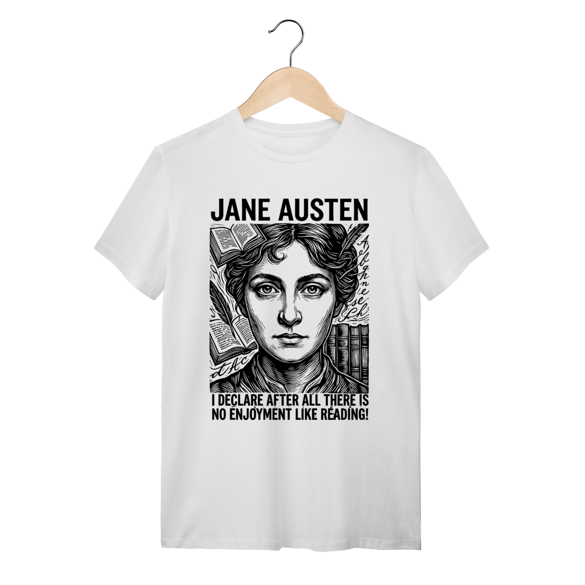 Camiseta básica, estampa frontal, centralizada de: Jane Austen, a brilhante romancista inglesa cujas obras capturaram a essência da sociedade do século XIX com ironia afiada, romance e profunda observação da natureza humana.