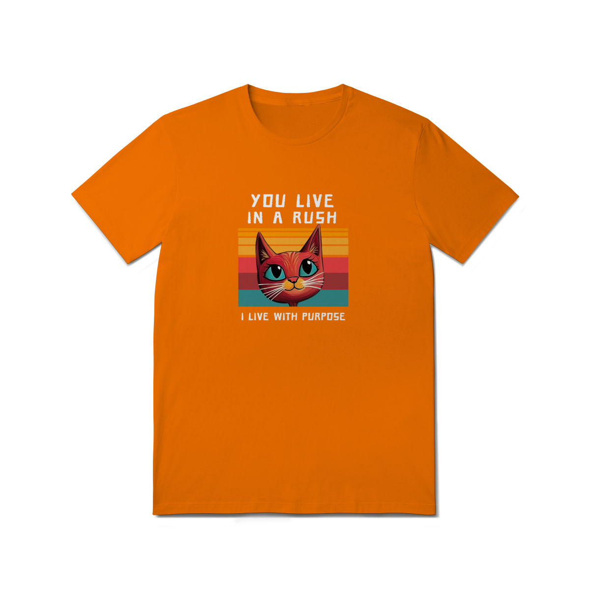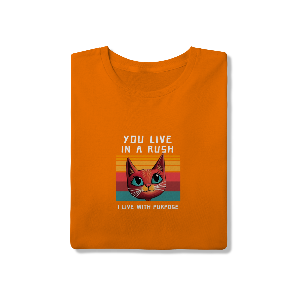 Camiseta Laranja, Camiseta Colorida, Gato Retro Sunset, Estampa Vintage, Live With Purpose, Slow Living, Algodão 30.1, Camiseta Unissex, Quality Premium, Cat Lover, Roupa Confortável