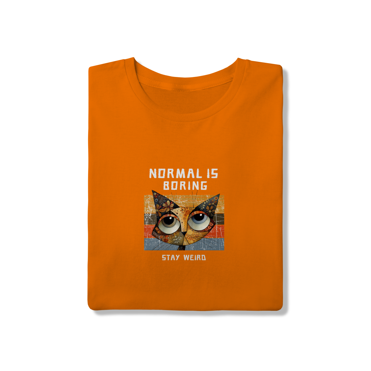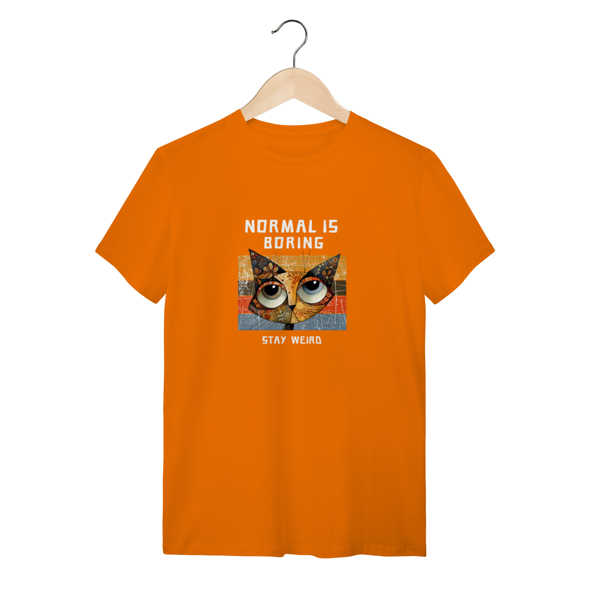 Criatividade e alto astral. A Camiseta Laranja foge do comum e mostra que você não tem medo de ser diferente. A estampa 'Stay Weird' é um convite para abraçar sua originalidade e fugir do tédio. Combina muito bem com jeans e tênis, criando um visual alegre para os fins de semana.