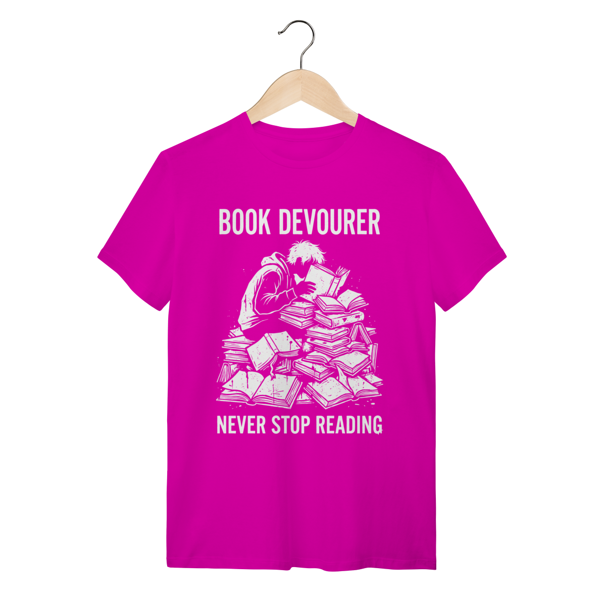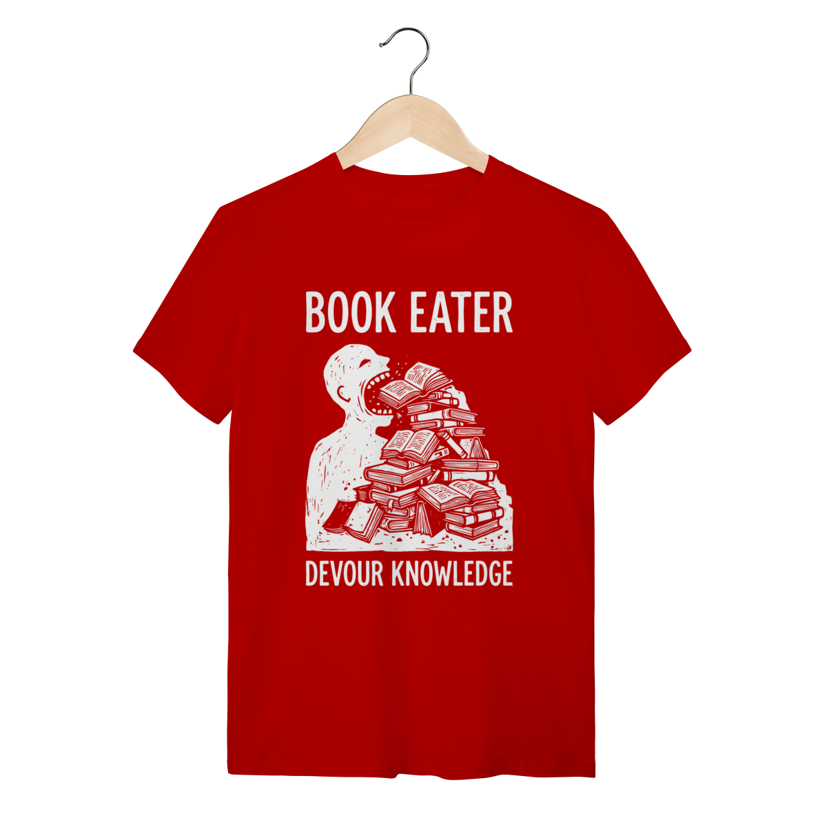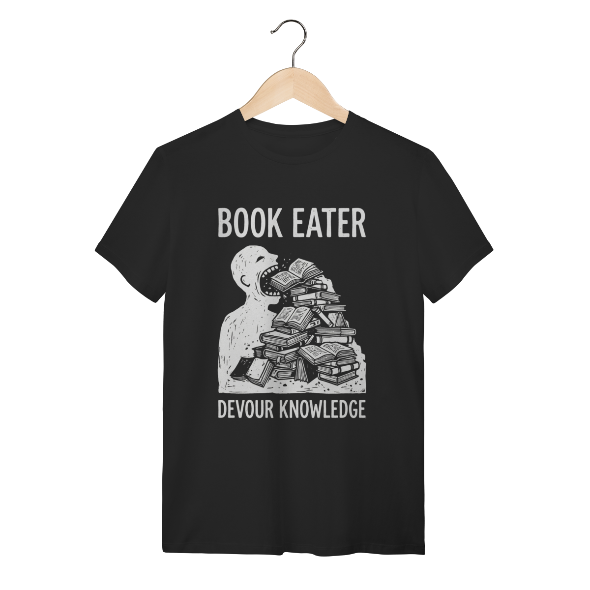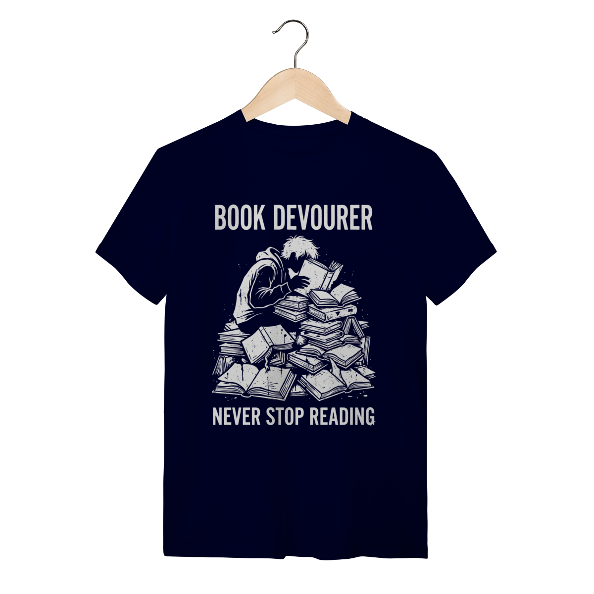 Ler não é apenas um passatempo, é uma necessidade vital. Esta estampa captura a essência daquele que encontra nos livros o alimento para a alma e para a mente. Mostre ao mundo que sua sede de saber é insaciável e vista o orgulho de ser um verdadeiro "Book Eater".
