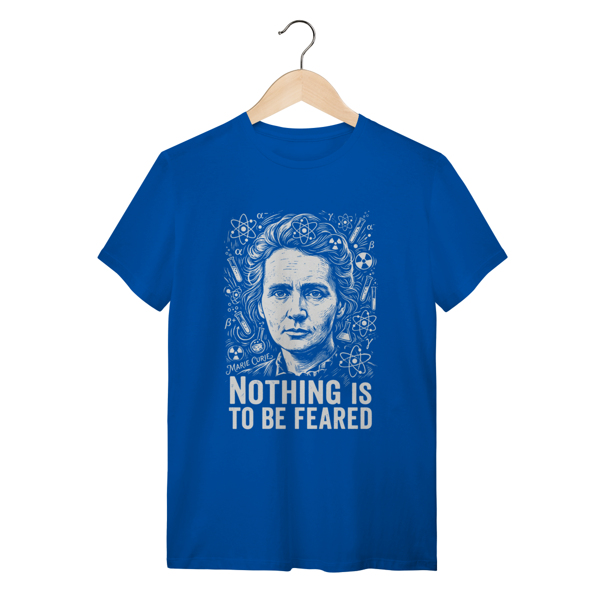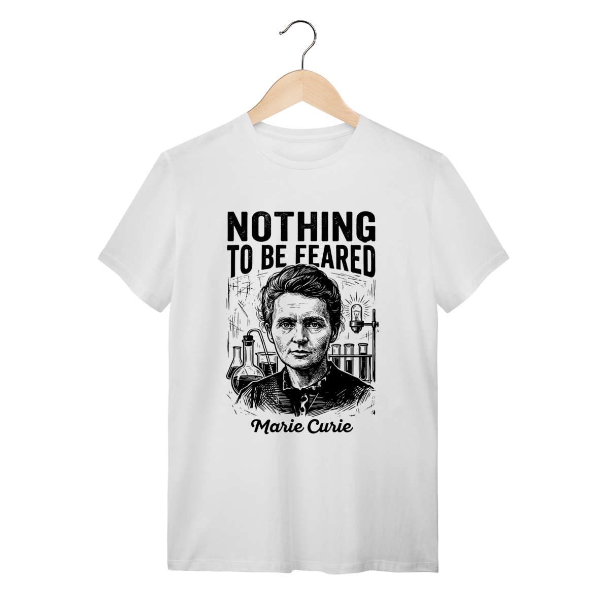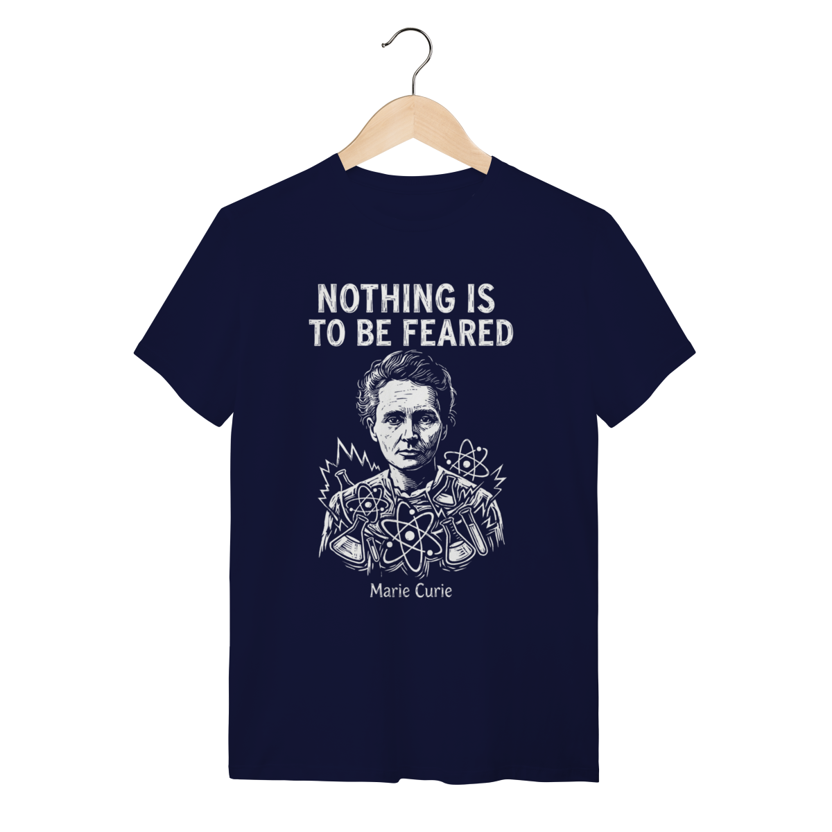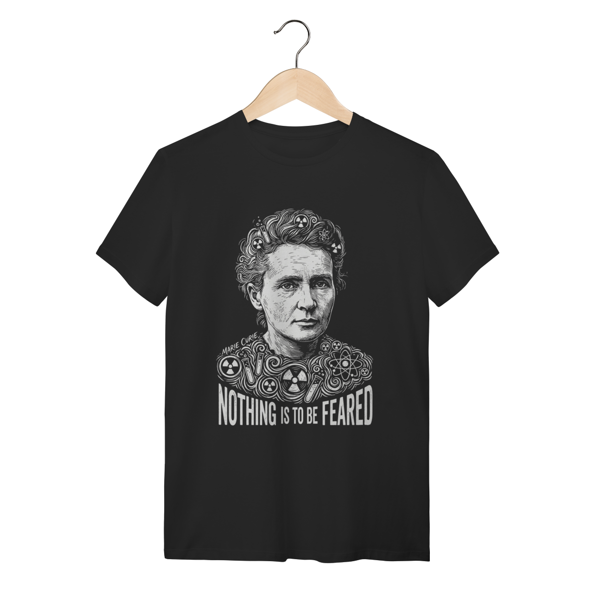 A ciência não é sobre certezas absolutas, é sobre a coragem de questionar a escuridão. Esta estampa não é apenas uma homenagem à mãe da radioatividade, é a materialização visual do estoicismo científico: Nothing Is To Be Feared, It Is Only To Be Understood.