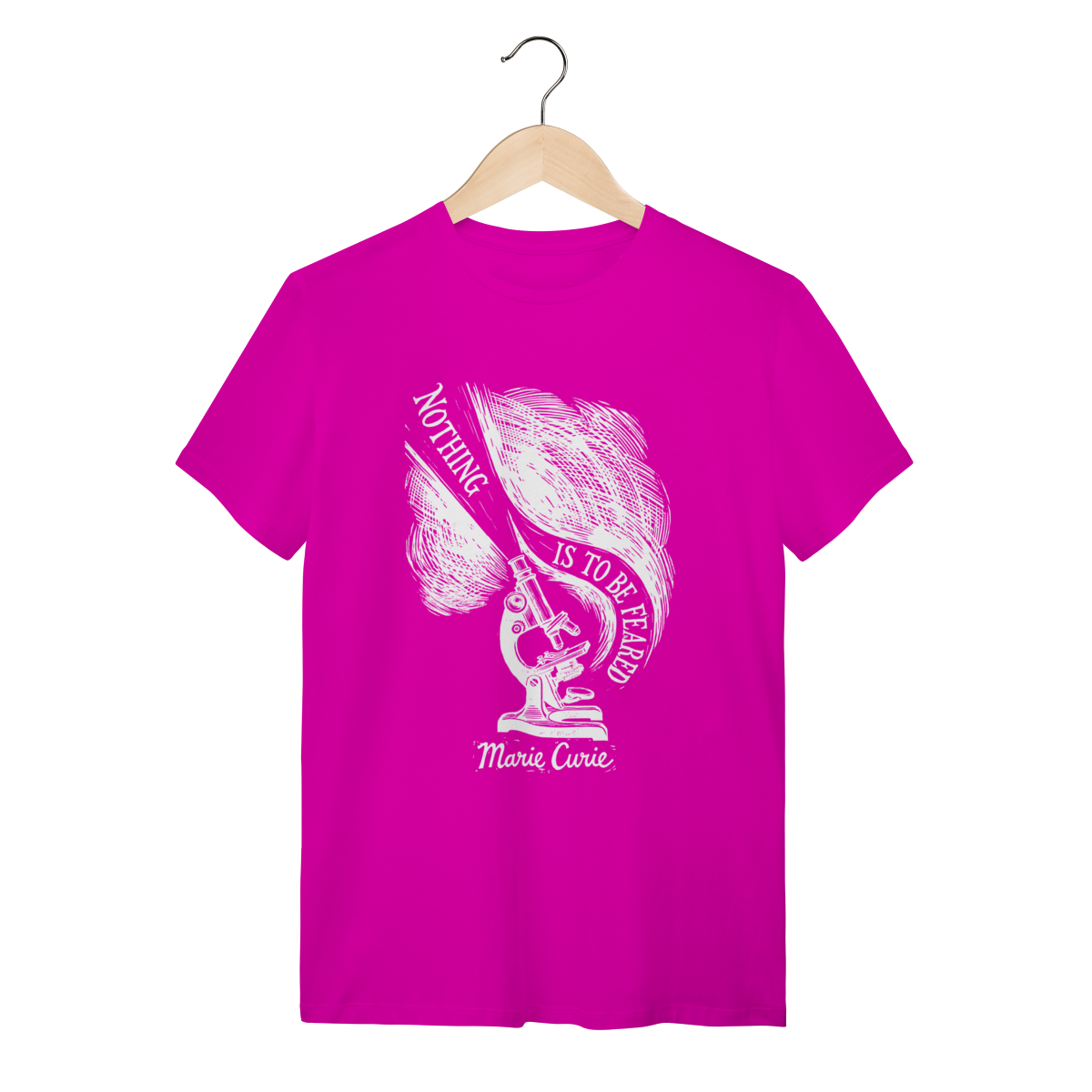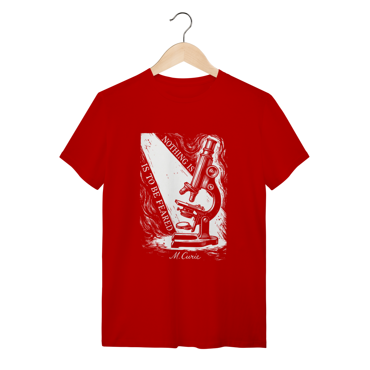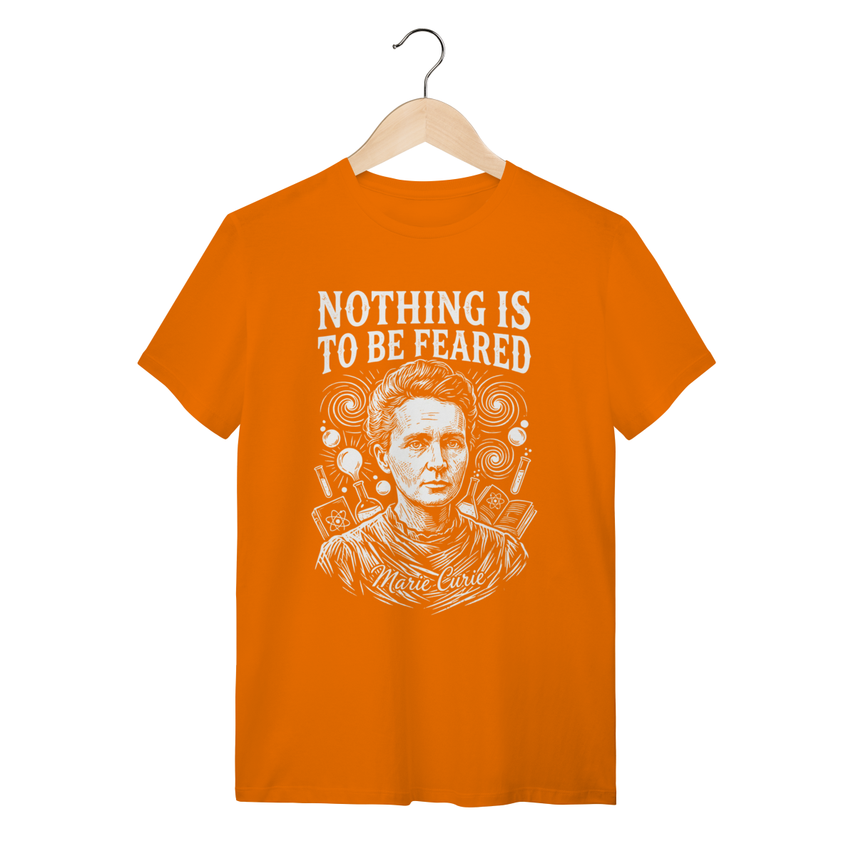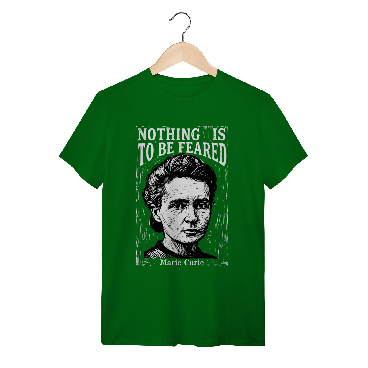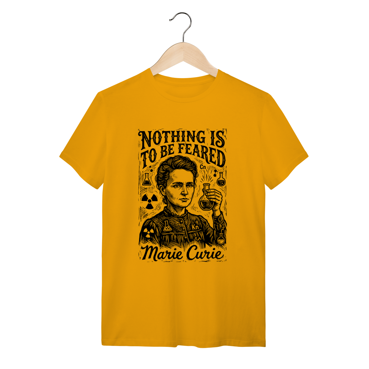 A ciência não é sobre certezas absolutas, é sobre a coragem de questionar a escuridão. Esta estampa não é apenas uma homenagem à mãe da radioatividade, é a materialização visual do estoicismo científico: Nothing Is To Be Feared, It Is Only To Be Understood.