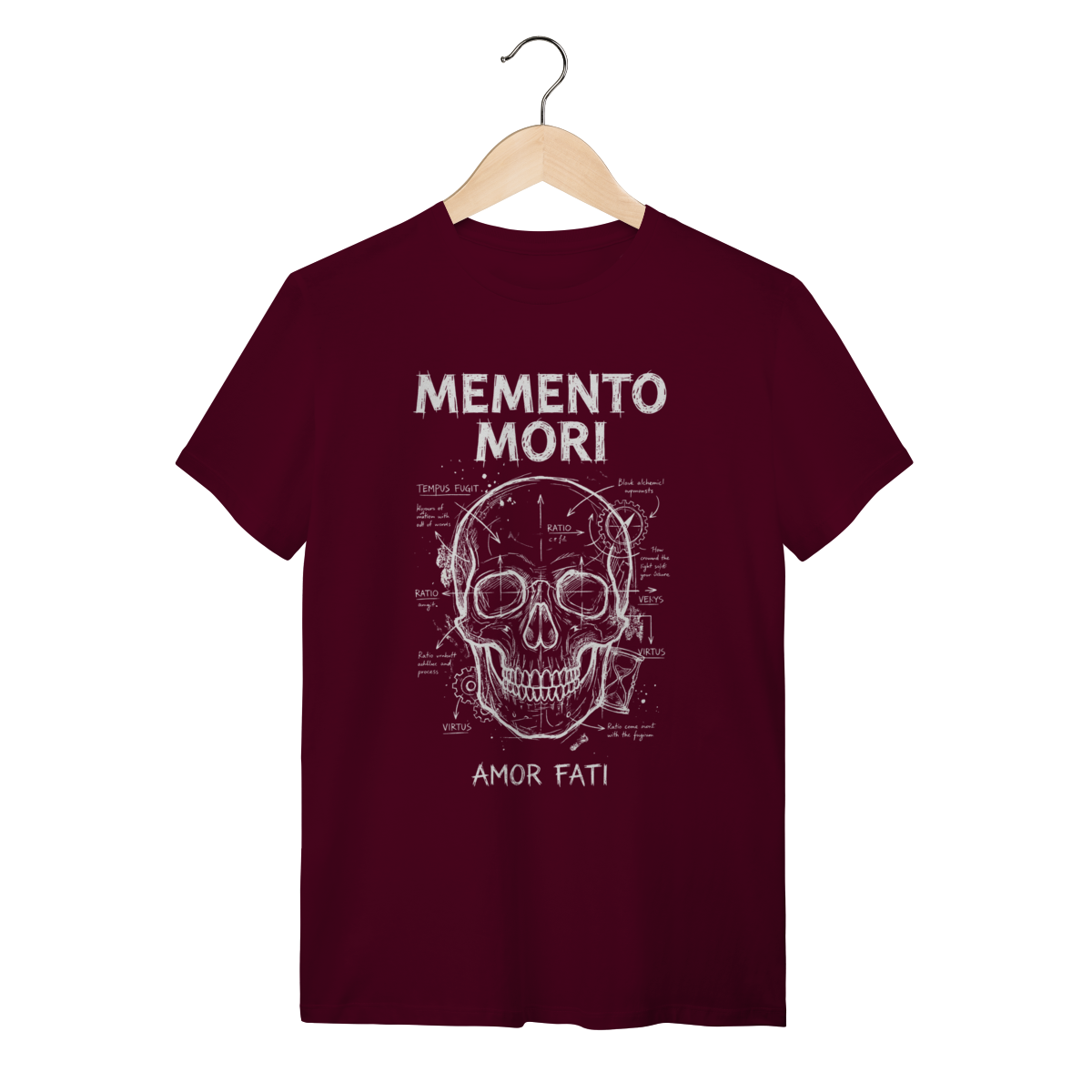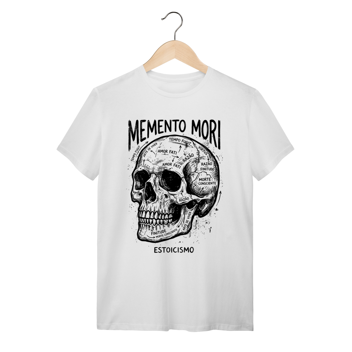 A estampa traz uma composição visual impactante com a estética de "esboço renascentista" ou diagrama técnico (blueprint). A ilustração central da caveira (símbolo da finitude humana) conecta-se com a ampulheta (o tempo inexorável) através de anotações, setas e linhas geométricas que lembram os estudos de Da Vinci. O traço texturizado estilo "giz" ou bico de pena confere um ar intelectual, transformando um conceito filosófico profundo em uma obra de arte vestível e sofisticada.