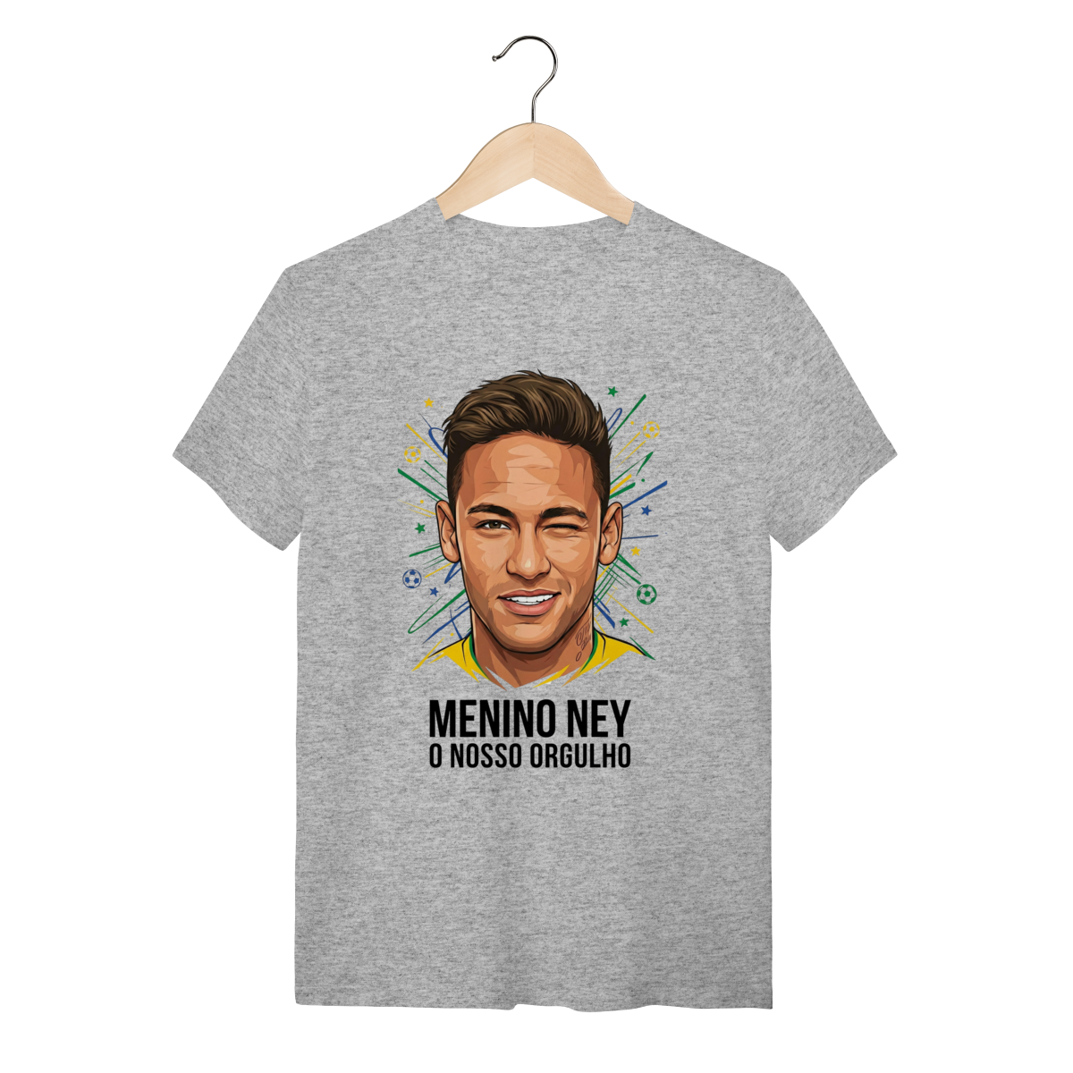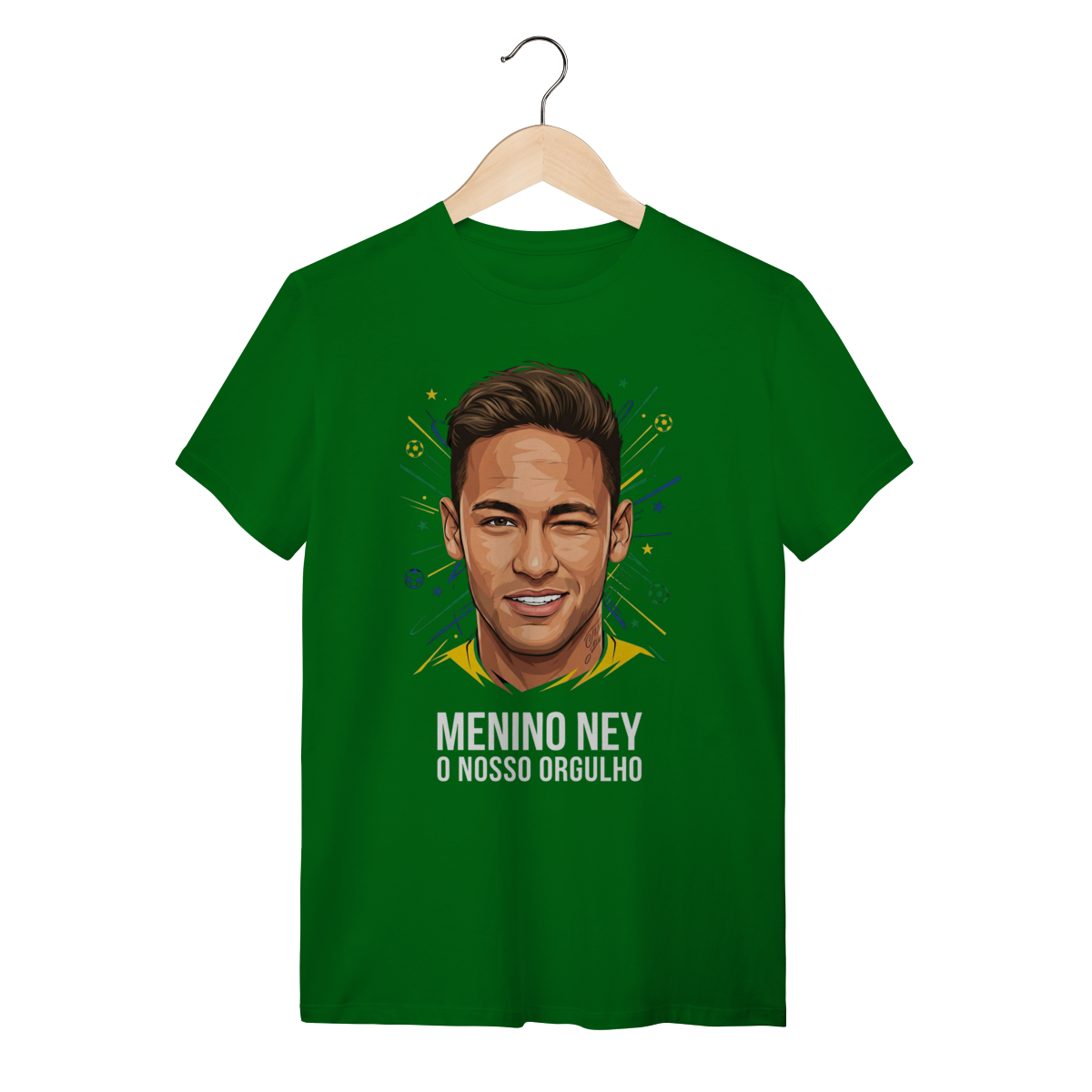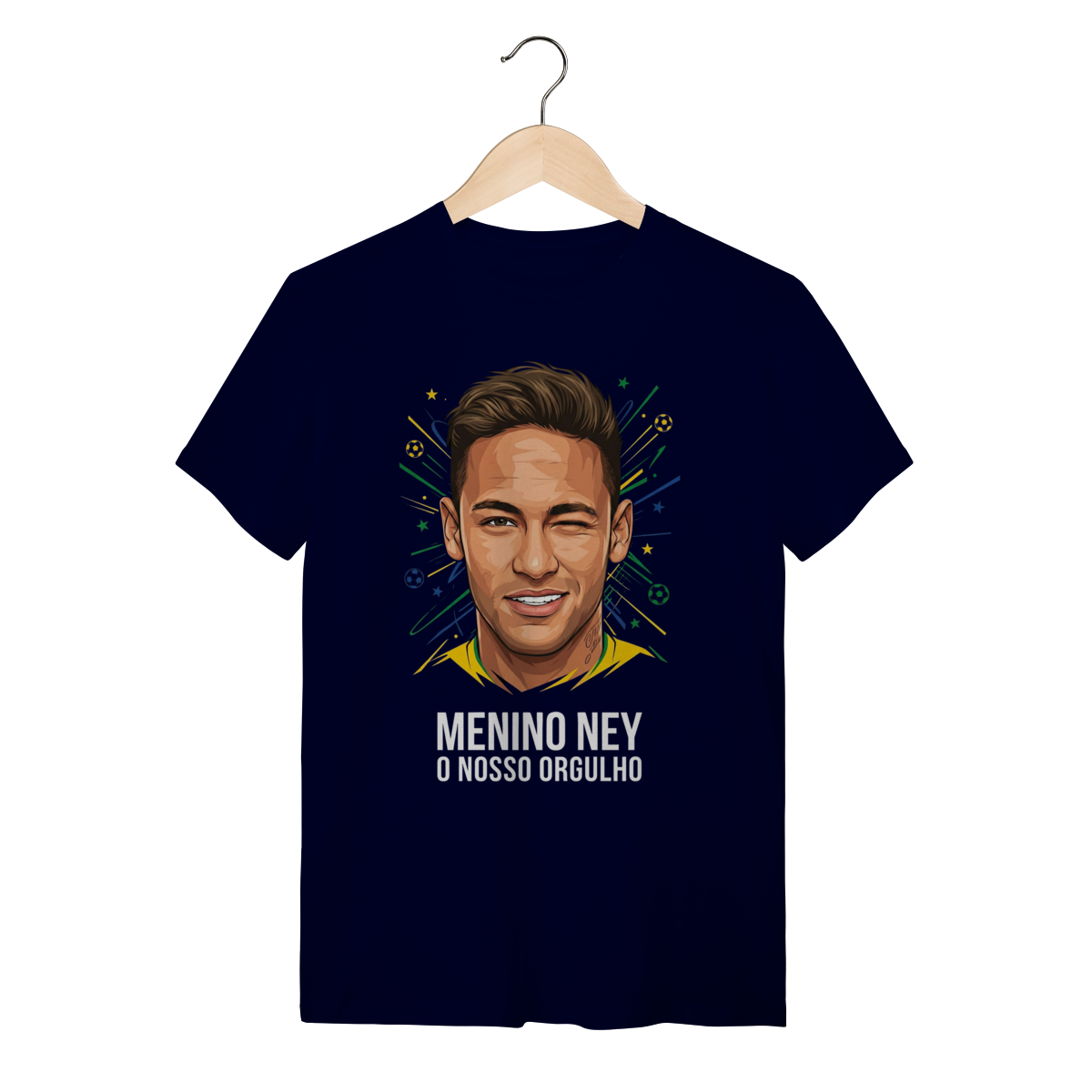 A estampa apresenta uma ilustração vibrante e cheia de atitude do Neymar Jr., capturando sua expressão icônica com uma "piscadinha" confiante e carismática. O traço vetorial moderno é cercado por elementos gráficos dinâmicos em verde, amarelo e azul, simulando fogos e estrelas que remetem à bandeira do Brasil. Abaixo do rosto, a frase "MENINO NEY O NOSSO ORGULHO" sela a arte com uma tipografia bold e impactante, destacando a idolatria nacional.