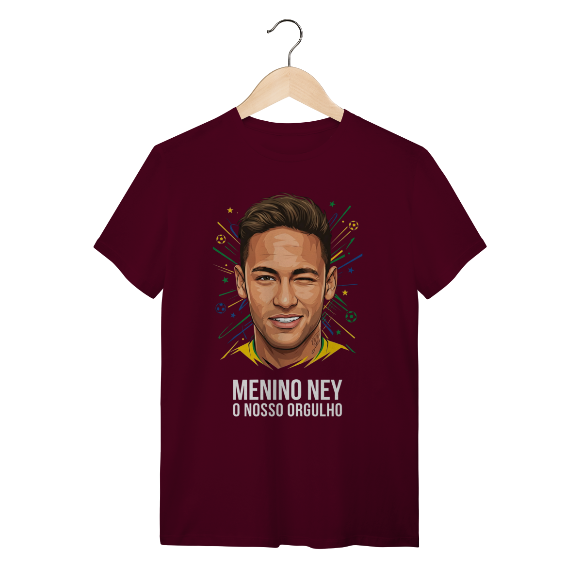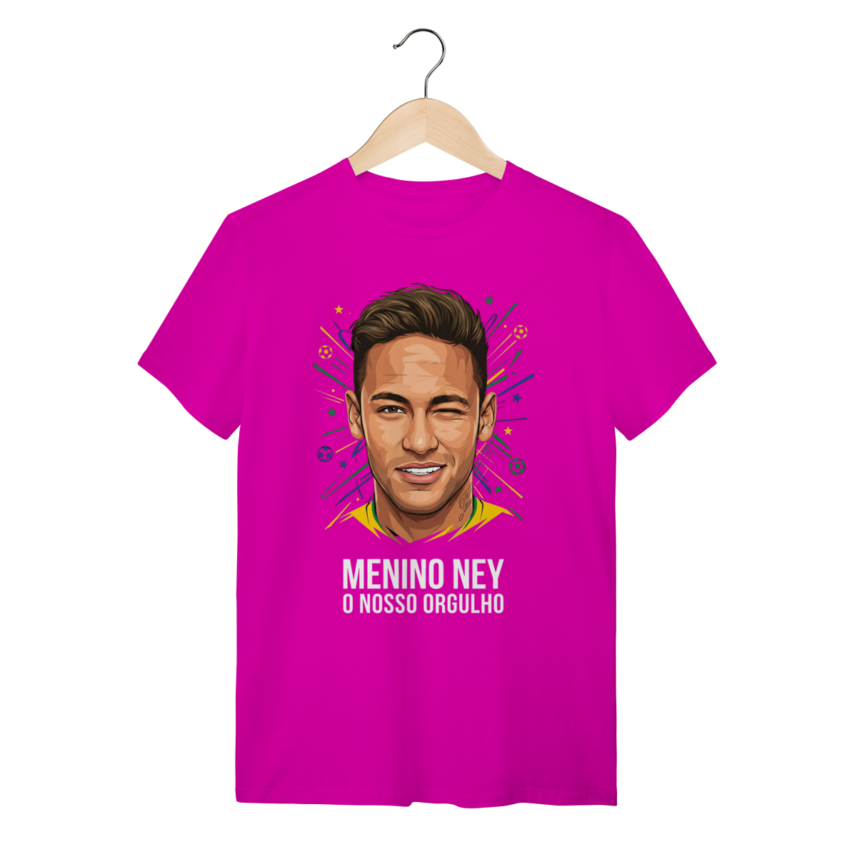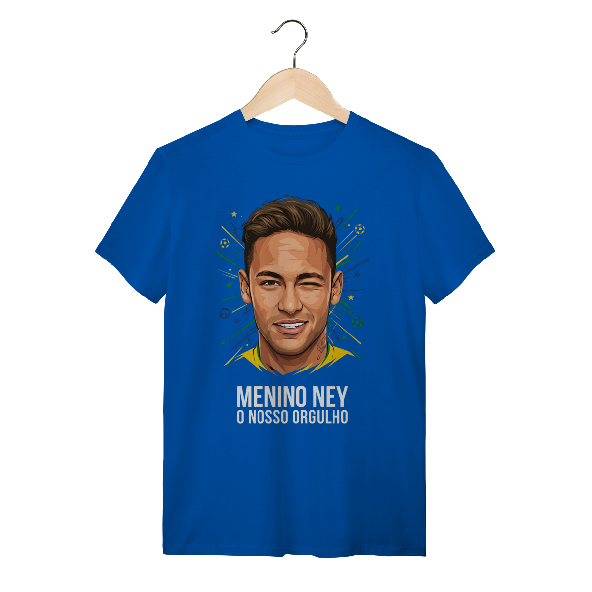 A estampa apresenta uma ilustração vibrante e cheia de atitude do Neymar Jr., capturando sua expressão icônica com uma "piscadinha" confiante e carismática. O traço vetorial moderno é cercado por elementos gráficos dinâmicos em verde, amarelo e azul, simulando fogos e estrelas que remetem à bandeira do Brasil. Abaixo do rosto, a frase "MENINO NEY O NOSSO ORGULHO" sela a arte com uma tipografia bold e impactante, destacando a idolatria nacional.