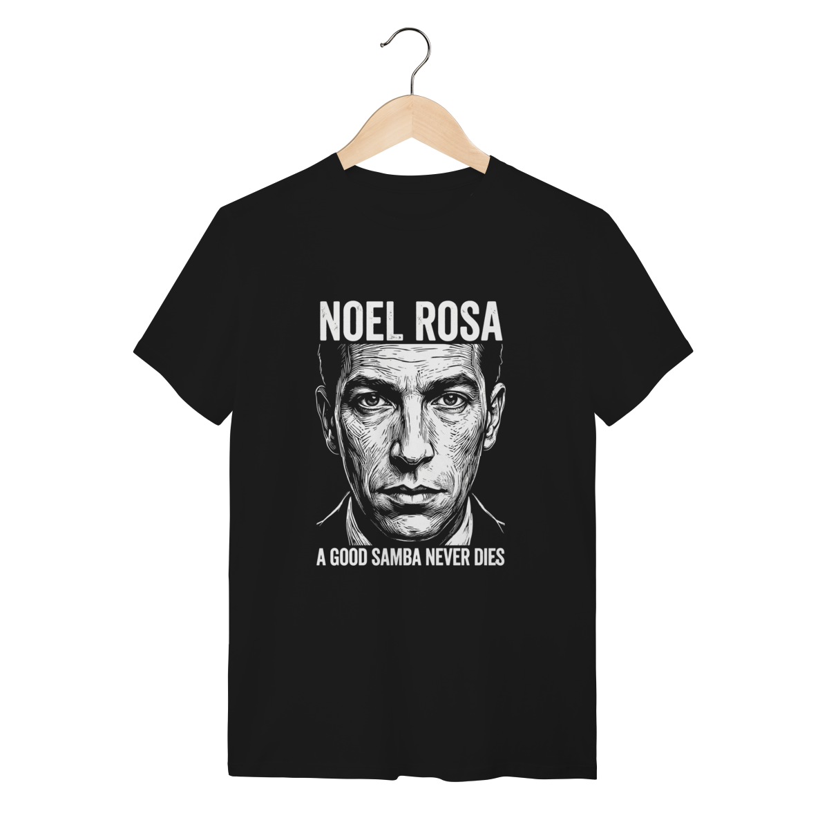 Camiseta Preta: Retrato focado e intenso de Noel Rosa em estilo linocut, acompanhado da tipografia "A GOOD SAMBA NEVER DIES".