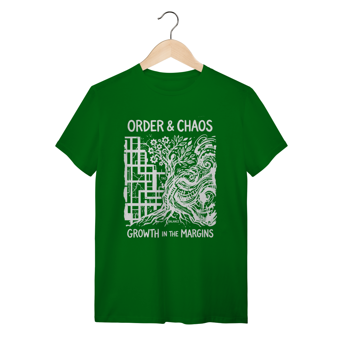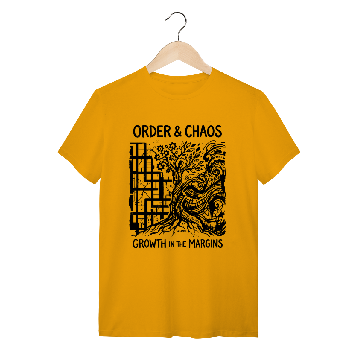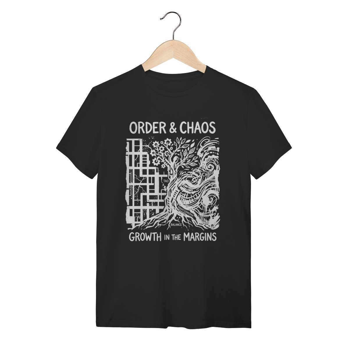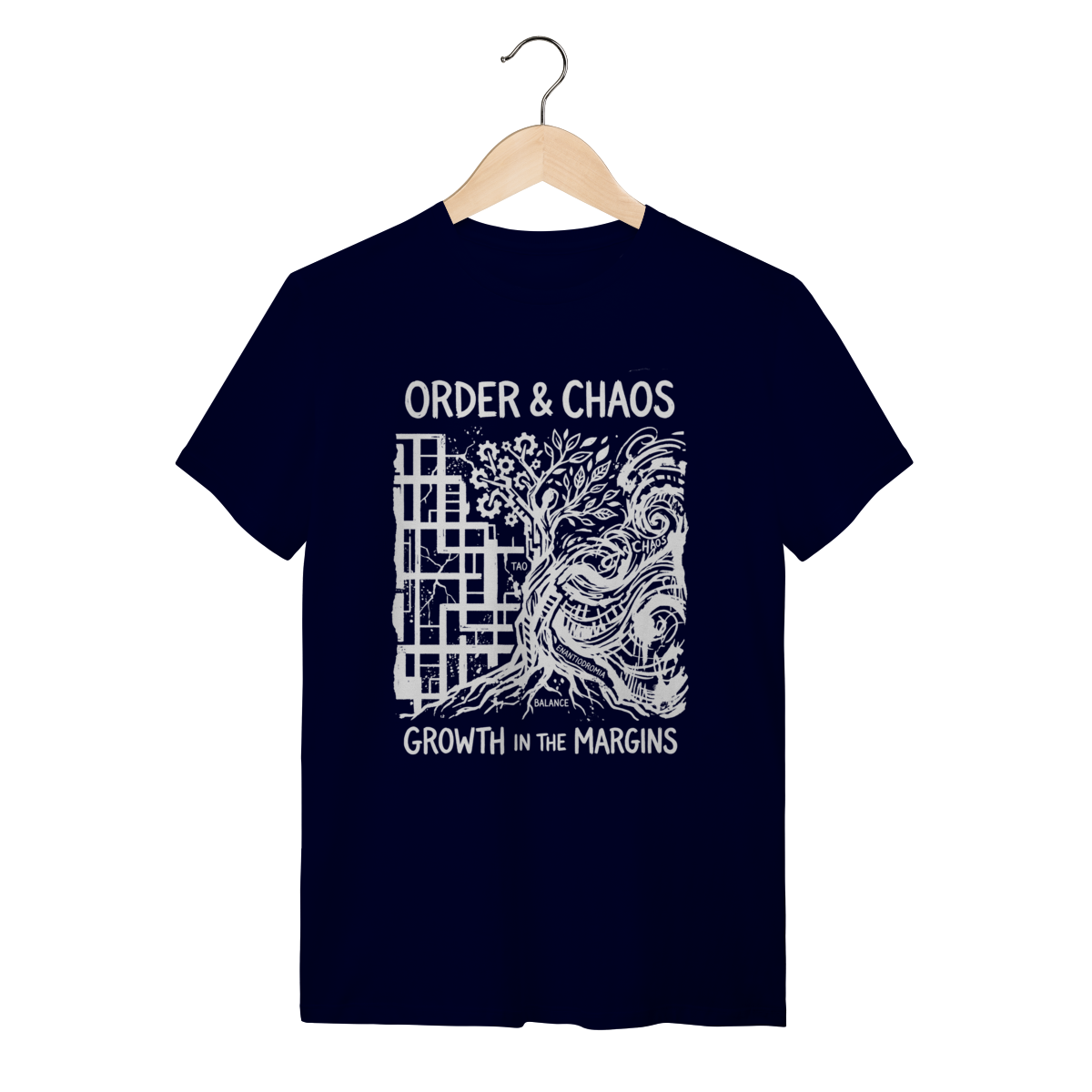 A arte apresenta uma divisão magistral: à esquerda, a "Ordem" é representada por grades geométricas, linhas retas e engrenagens industriais, simbolizando a lógica e a estrutura. À direita, o "Caos" explode em formas orgânicas, espirais de vento e folhas naturais, evocando a criatividade e o imprevisível. No centro, uma árvore conecta os dois mundos, com raízes profundas ancoradas no "Equilíbrio" (Balance), ilustrando perfeitamente a frase "Growth in the Margins" (Crescimento nas Margens).