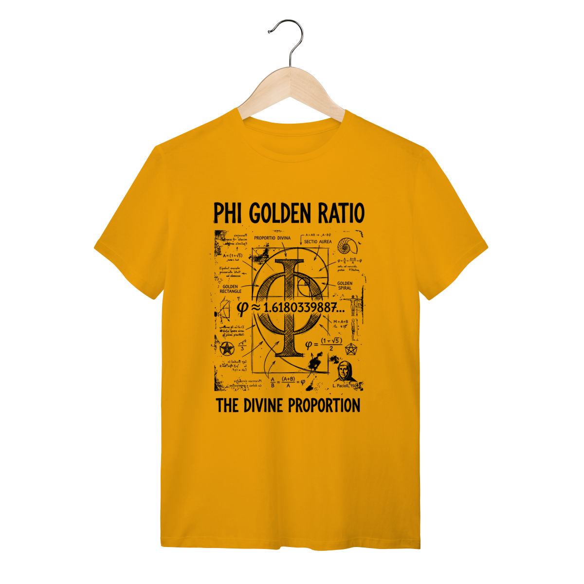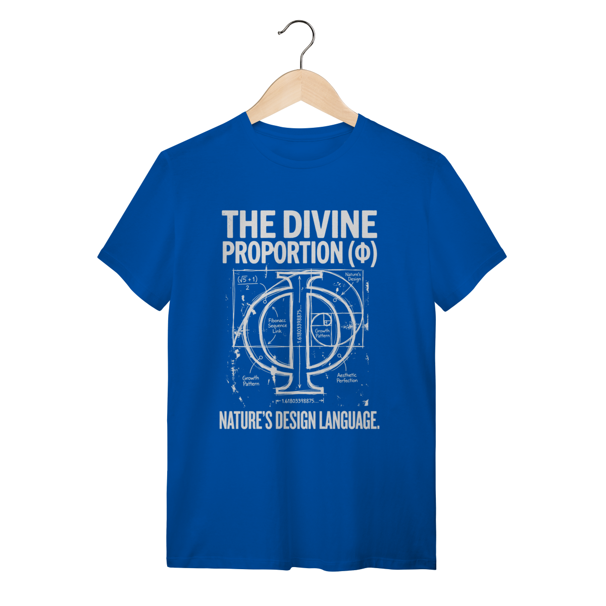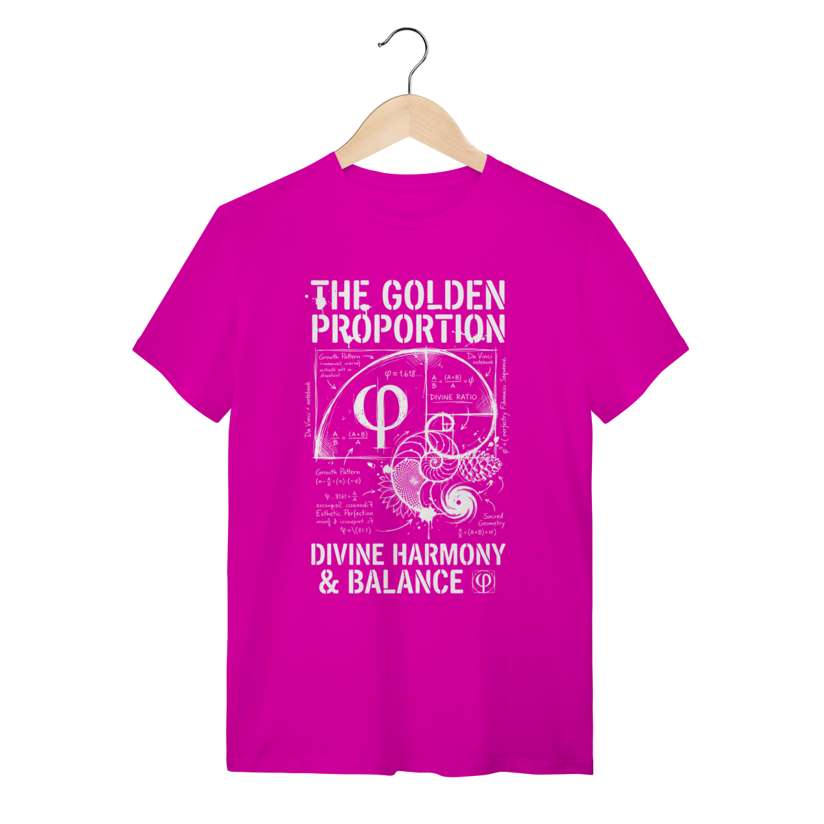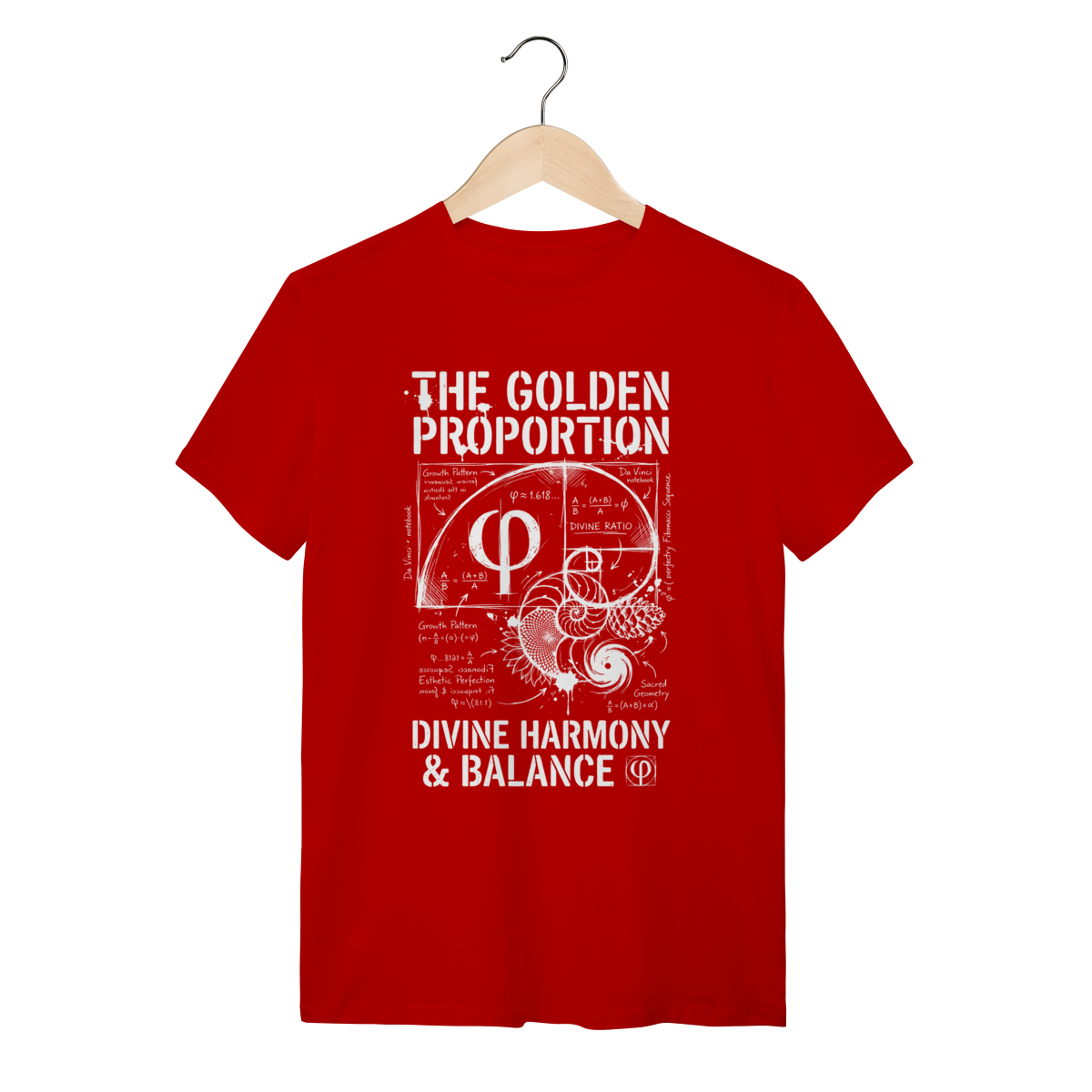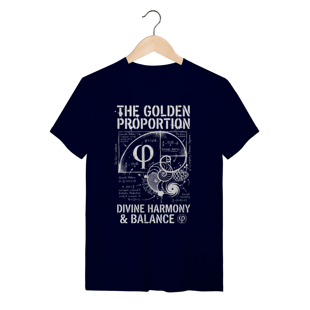 A estampa traz o símbolo grego Phi ($\Phi$) entrelaçado com a Espiral de Fibonacci e diagramas técnicos da "Divina Proporção". Com um estilo visual de "rascunho de engenharia" ou anotações de um caderno de Da Vinci, a arte exibe fórmulas, cálculos e a geometria sagrada em um design vintage e intelectual. É uma peça que mistura o rústico do traço à mão livre com a precisão absoluta dos números.