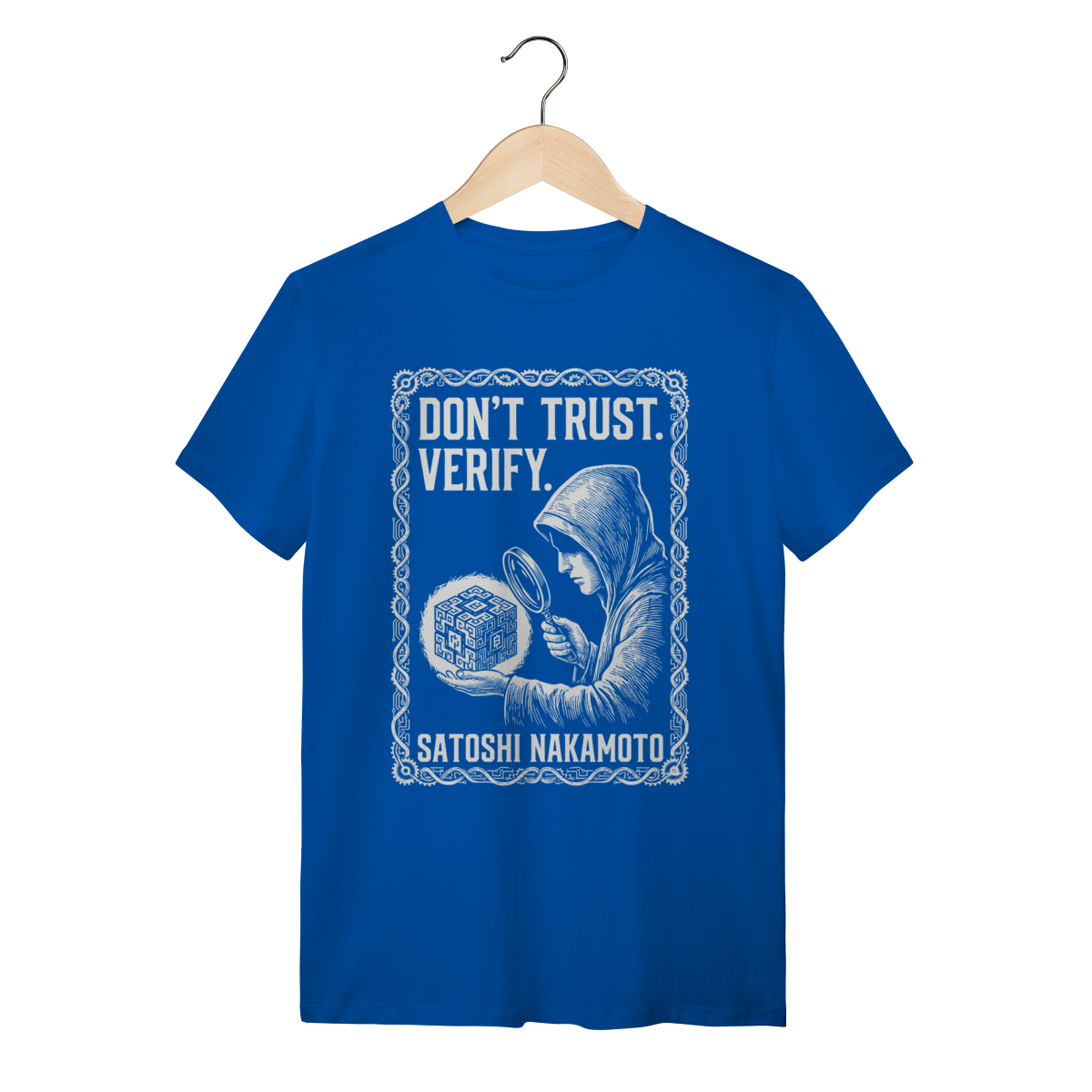 Esta peça carrega o axioma fundamental da revolução criptográfica: "Don't Trust. Verify." (Não Confie. Verifique.). Uma estampa técnica em estilo Linocut/Woodcut Grunge que materializa o código e a filosofia de Satoshi Nakamoto. Não é apenas vestuário, é um manifesto de soberania individual.