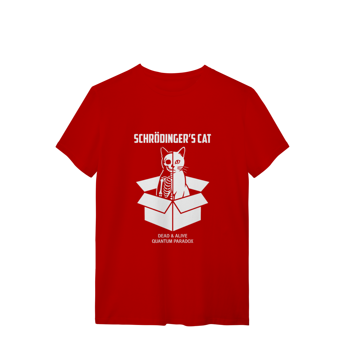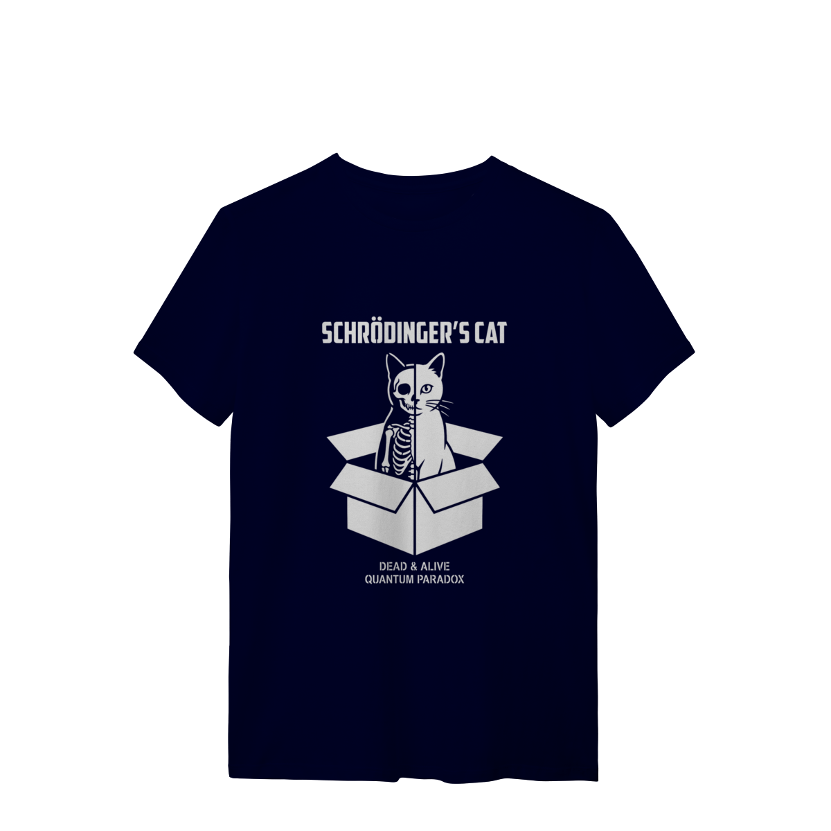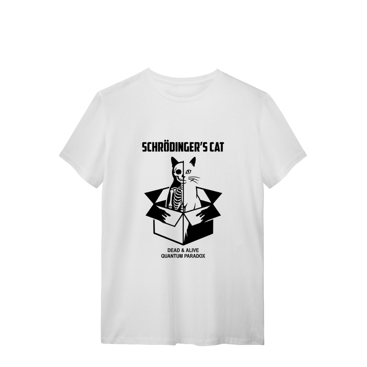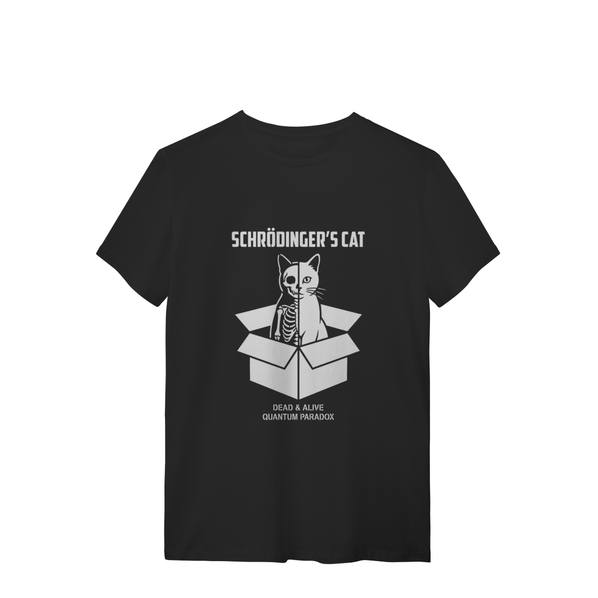 A Solução: Esta peça foi desenhada para o entusiasta intelectual. Com uma estética limpa em estêncil, ela representa o experimento mental mais famoso da ciência: o gato que está vivo e morto simultaneamente até ser observado.