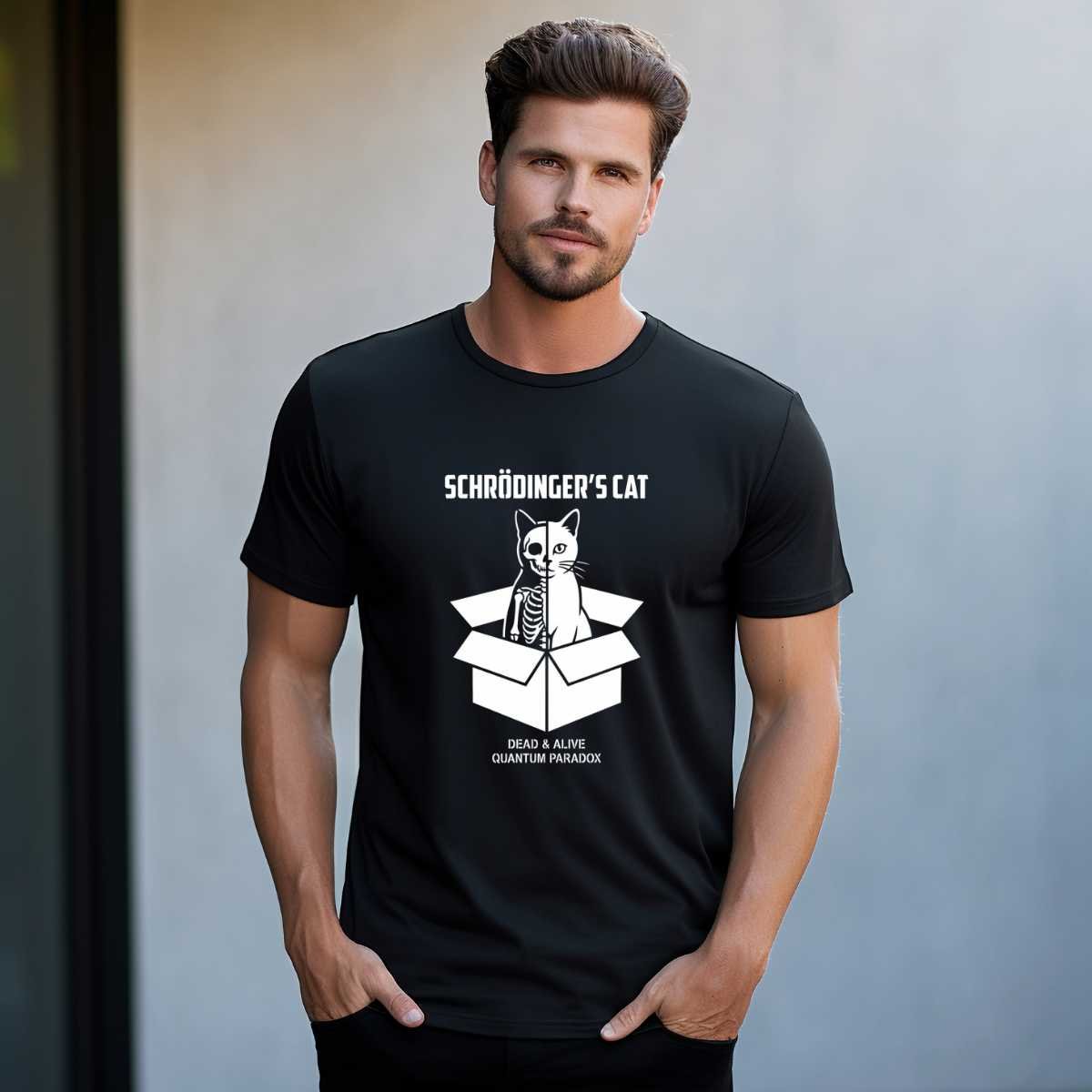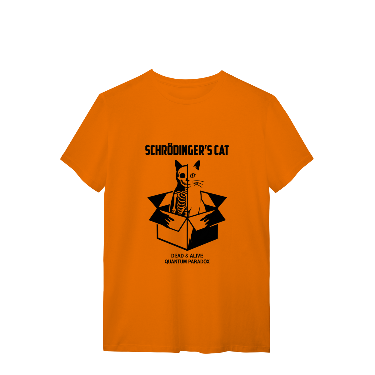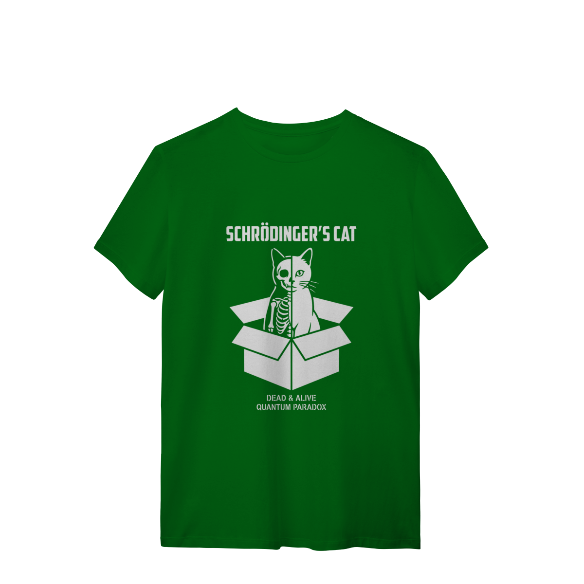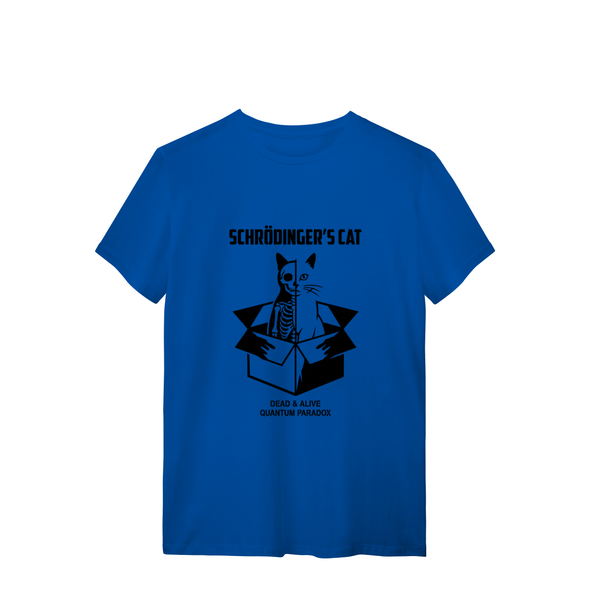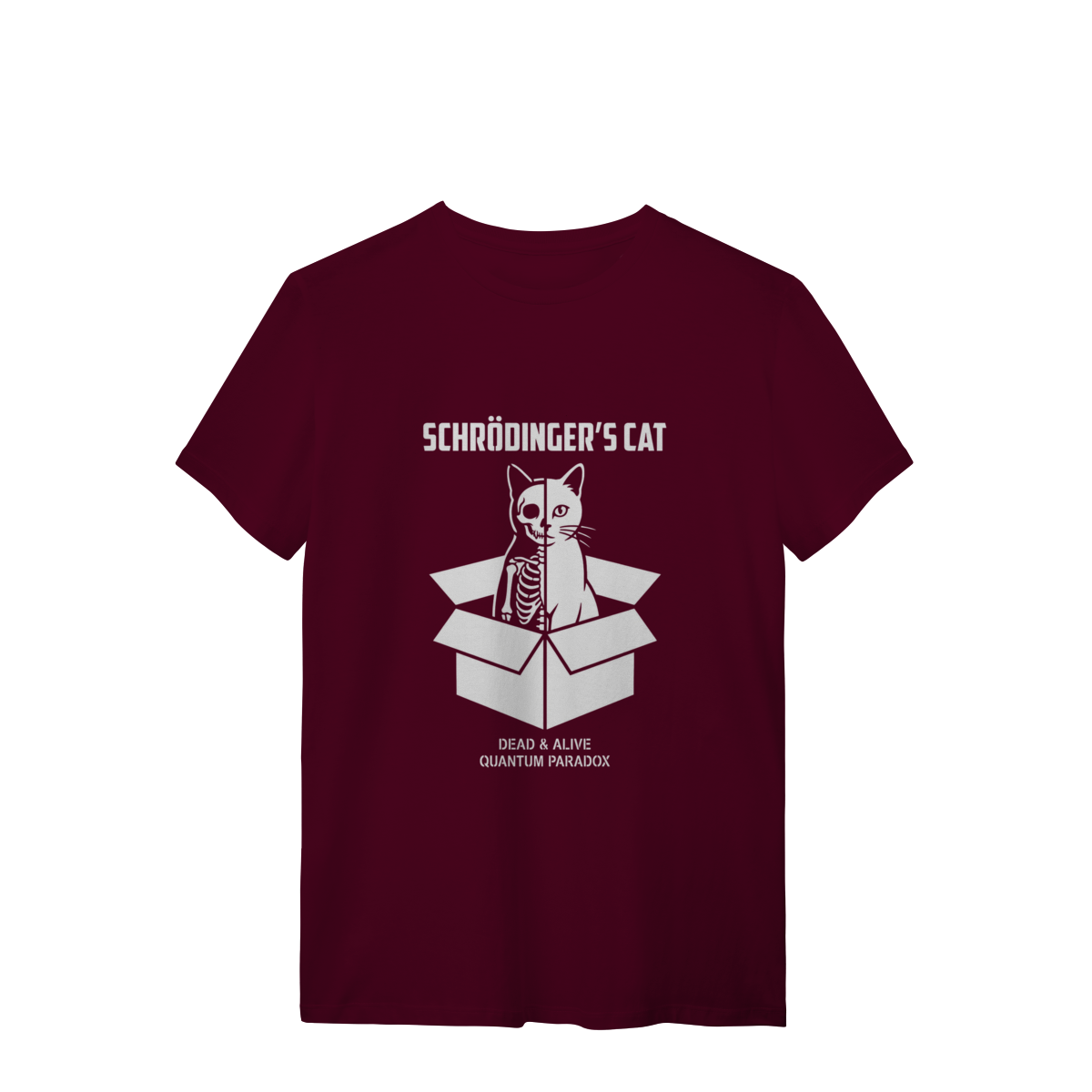 A Solução: Esta peça foi desenhada para o entusiasta intelectual. Com uma estética limpa em estêncil, ela representa o experimento mental mais famoso da ciência: o gato que está vivo e morto simultaneamente até ser observado.
