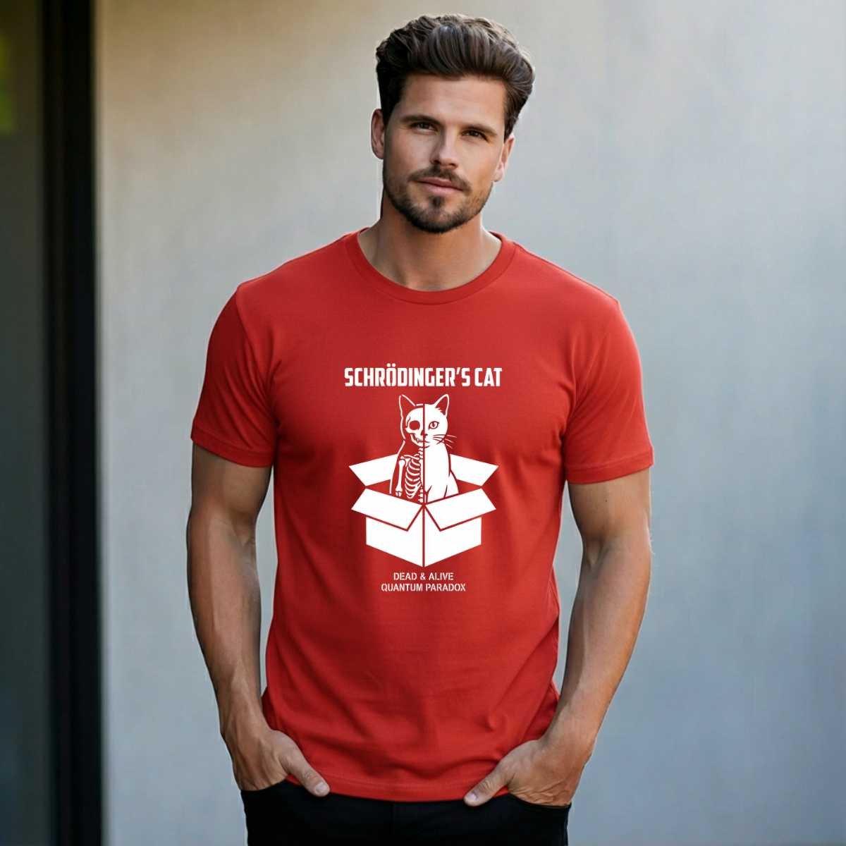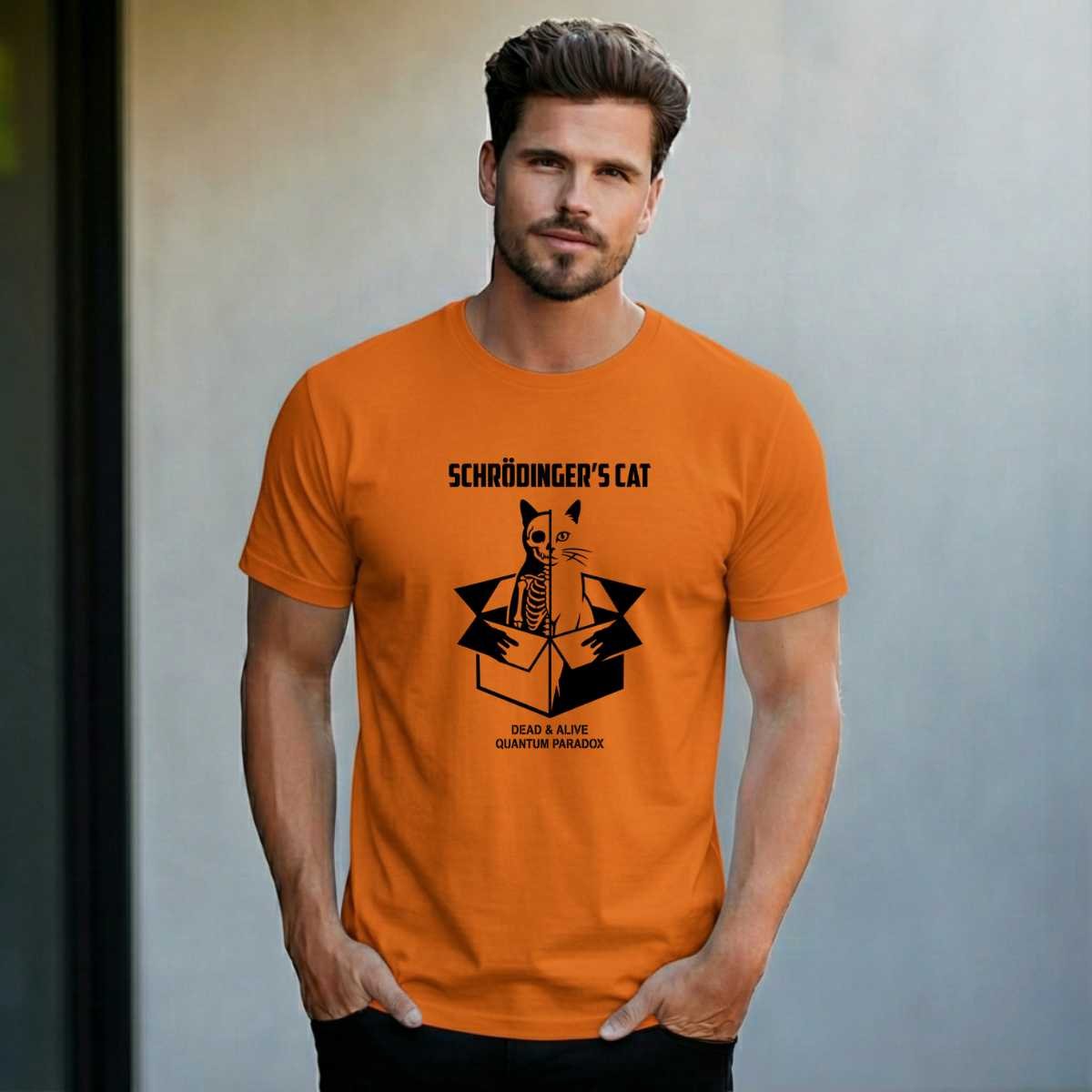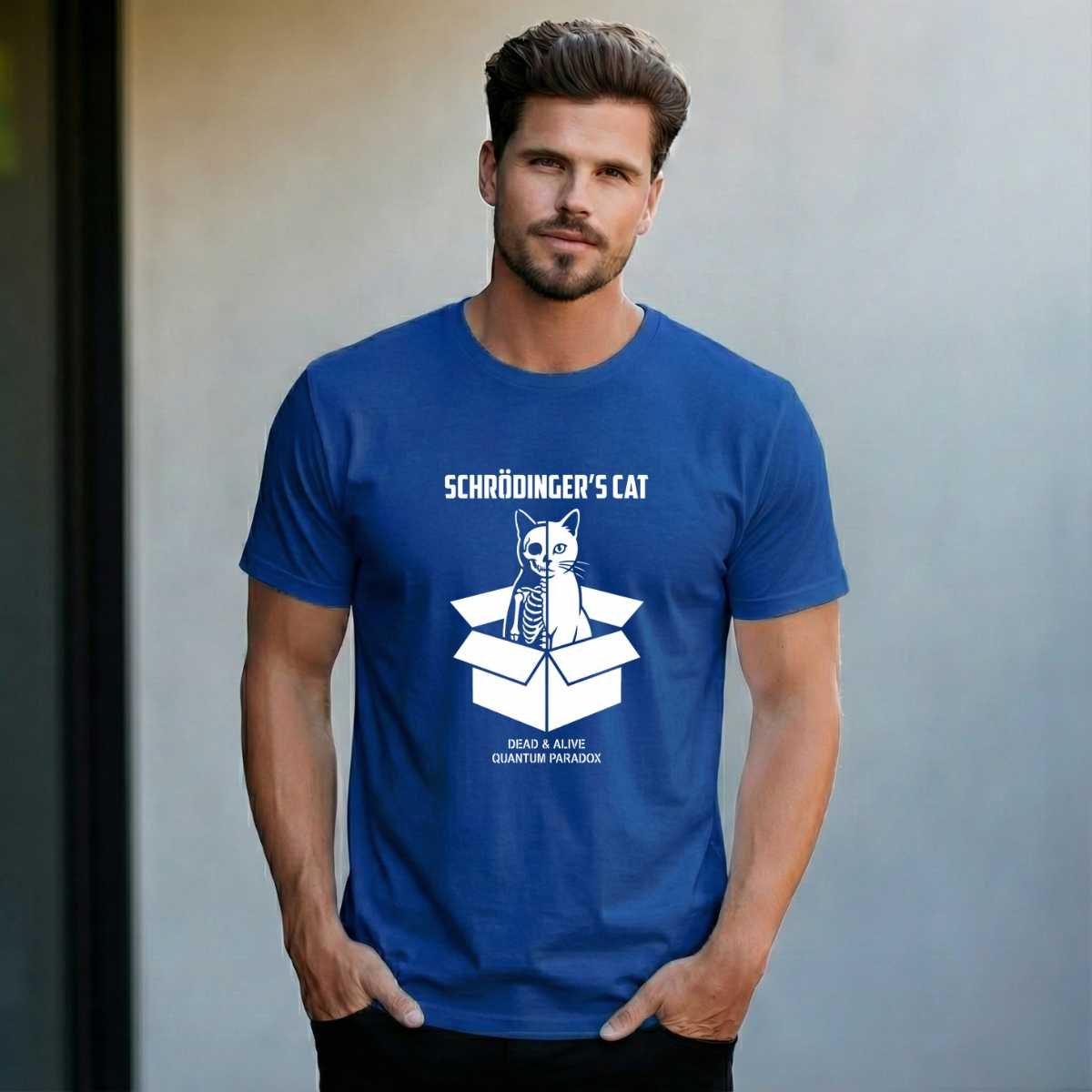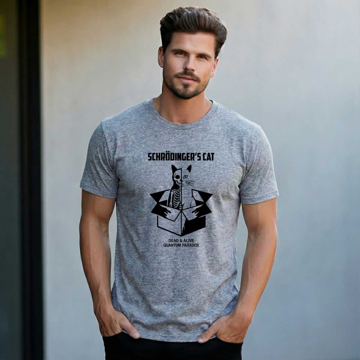 A Solução: Esta peça foi desenhada para o entusiasta intelectual. Com uma estética limpa em estêncil, ela representa o experimento mental mais famoso da ciência: o gato que está vivo e morto simultaneamente até ser observado.