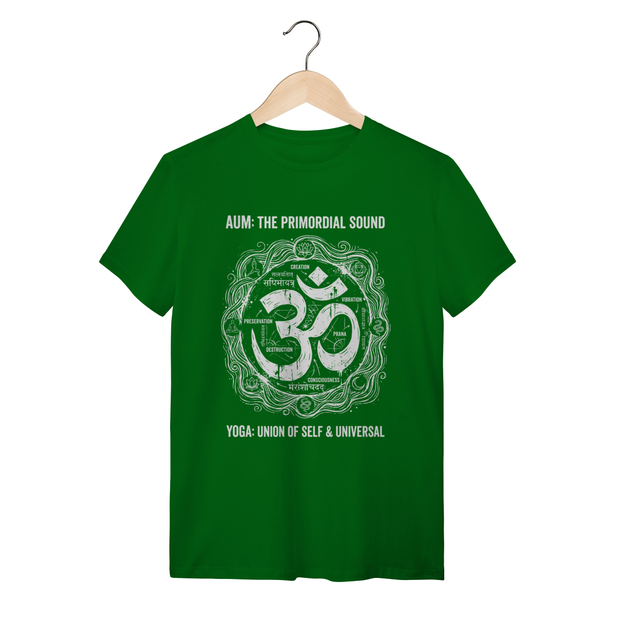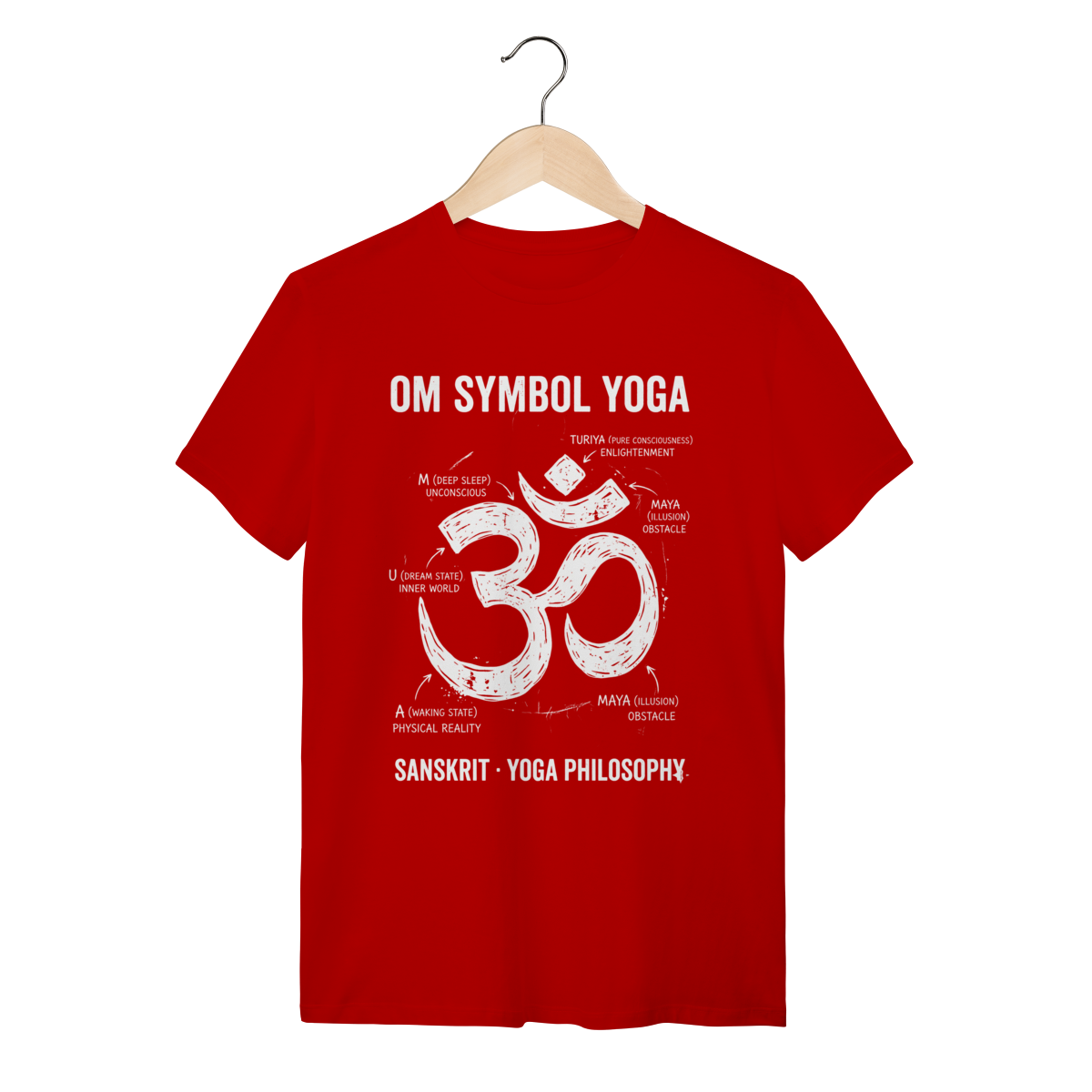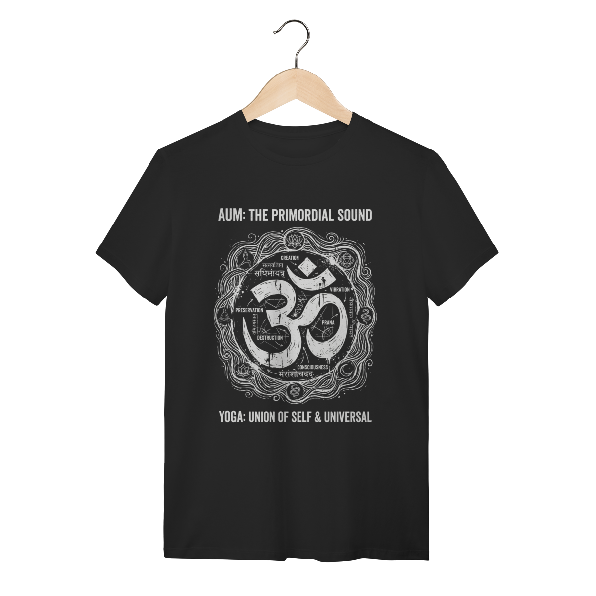 A estampa foge do comum ao apresentar o sagrado Om como um "diagrama técnico da consciência". O design disseca o símbolo sânscrito com uma estética de esboço de engenharia ou estudo anatômico, detalhando através de anotações e setas os estados da mente: o despertar, o sonho, o sono profundo e a ilusão (Maya). O traço texturizado estilo "grunge" ou giz sobre quadro negro confere um ar intelectual e rústico, transformando um ícone espiritual em uma peça de arte vestível, complexa e sofisticada.