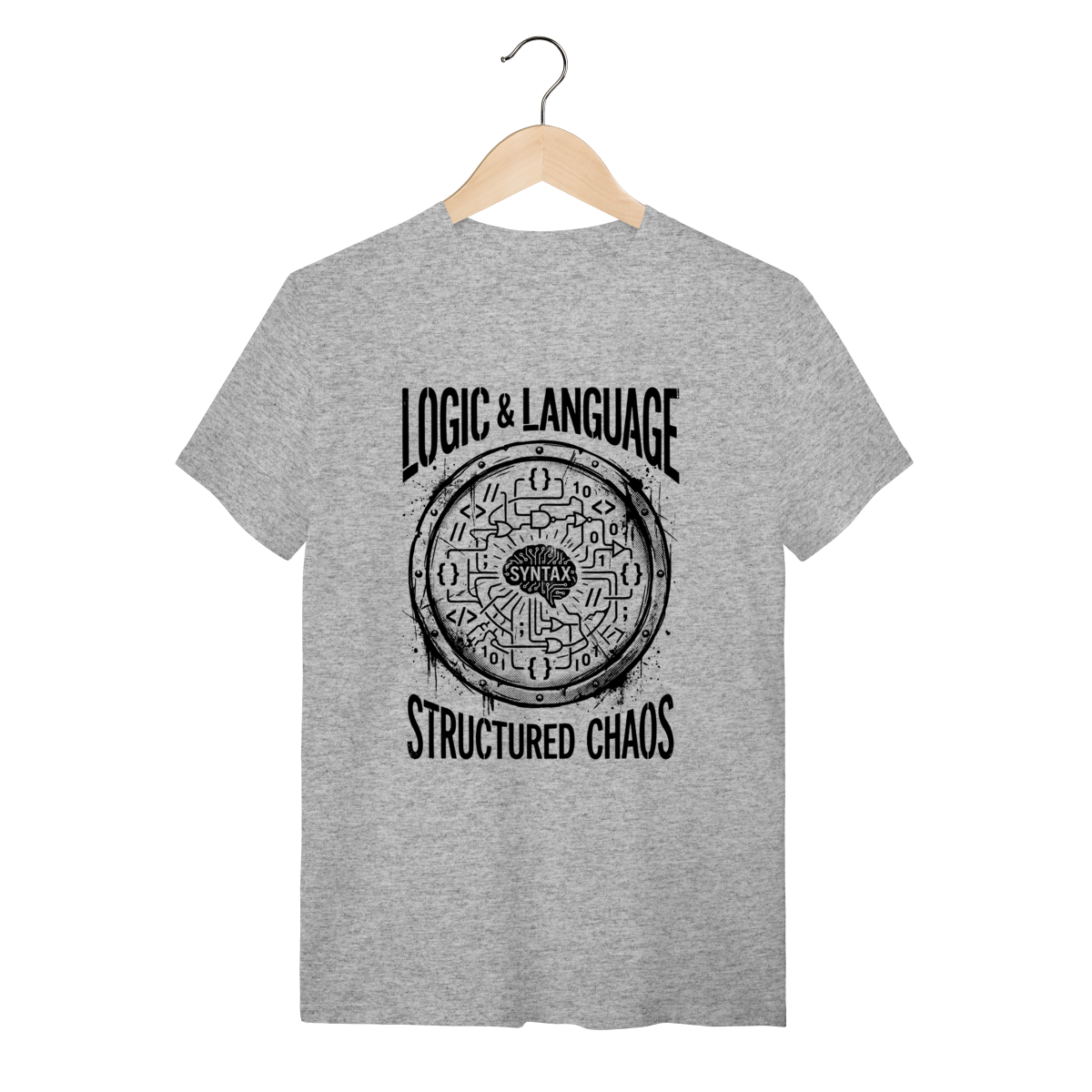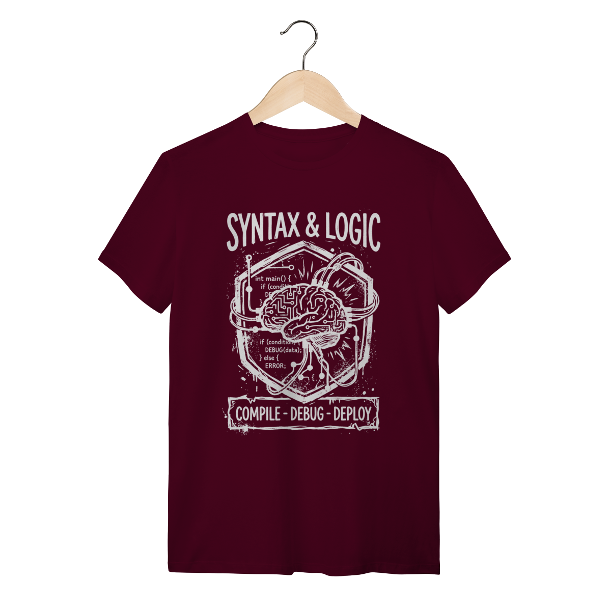 A estampa apresenta uma estética visual impressionante de "diagrama técnico de software" com acabamento grunge vintage. O design funde elementos clássicos da programação — como chaves { }, ponteiros, fluxogramas lógicos, comandos if/else e circuitos integrados — com a representação gráfica de um cérebro processando dados. O traço rústico, semelhante a um carimbo ou linocut, transforma conceitos abstratos de lógica e sintaxe em uma obra de arte industrial e sofisticada.