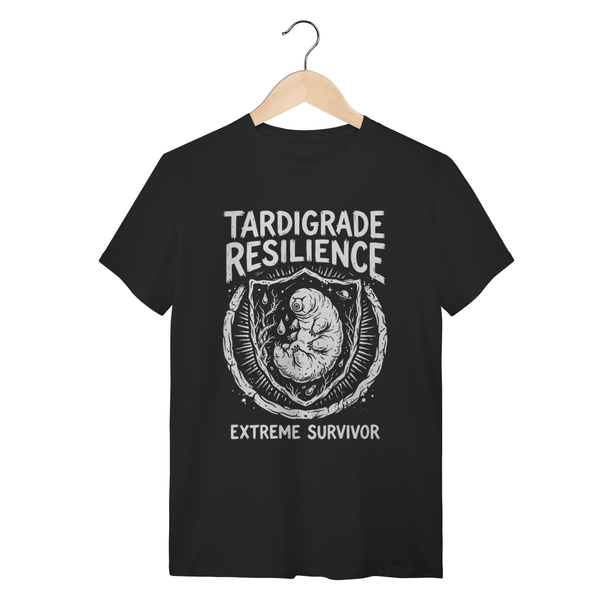 A estampa apresenta uma ilustração detalhada em estilo gravura científica (woodcut), capturando a textura rugosa e a anatomia fascinante do Tardígrado. Envolto por elementos cósmicos e símbolos de radiação, o design destaca o status de "Extreme Survivor" da criatura. O traço artístico confere um ar vintage e acadêmico, transformando um organismo biológico em uma obra de arte imponente e curiosa.