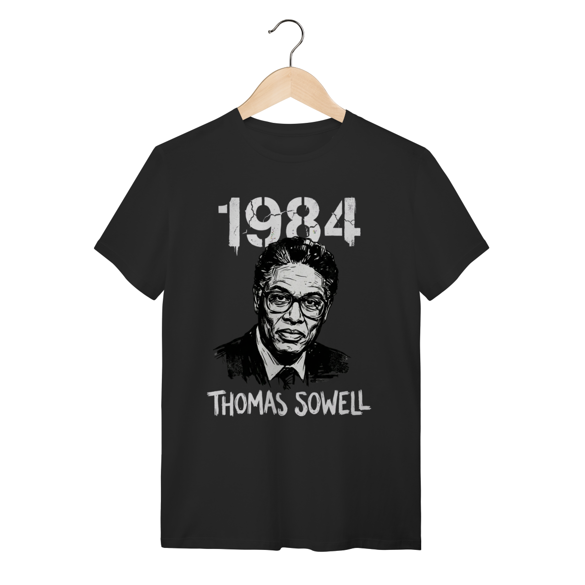 A estampa traz um design impactante estilo stencil art (arte de rua), com texturas grunge e desgastadas que remetem à resistência urbana. O rosto de Sowell em alto contraste preto e branco, sob o ano "1984", cria uma estética visual séria, moderna e provocativa, perfeita para quem tem personalidade forte.