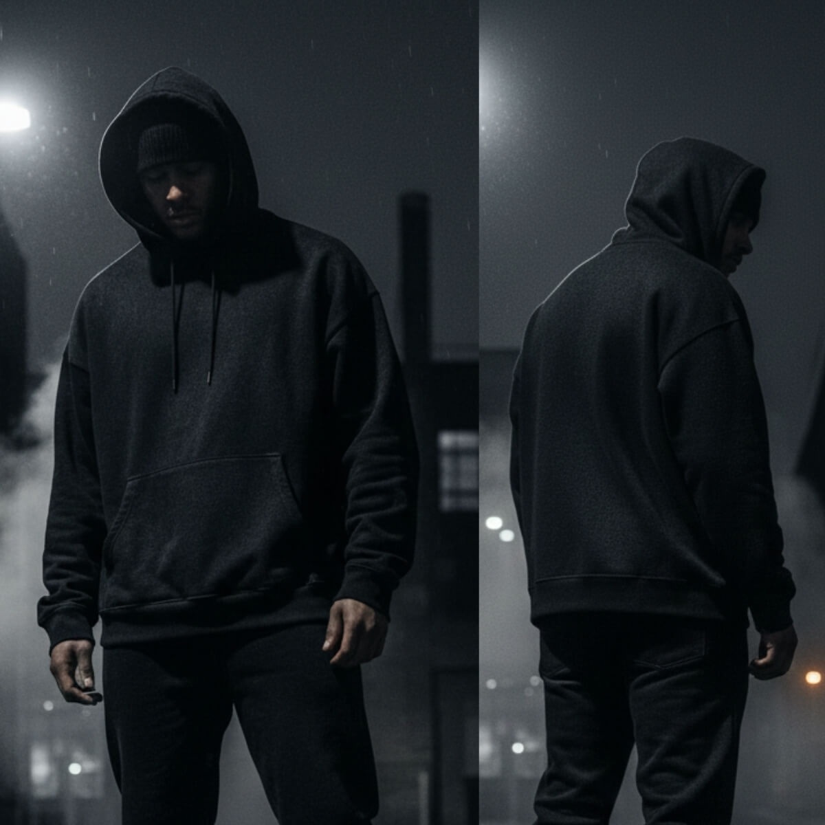 Malha pesada 2 cabos (310 g/m²), 50% algodão + 50% poliéster, interior 100% flanelado ultra macio, capuz com cordão ajustável, bolso canguru frontal grande, punhos e barra em ribana reforçada que não enrola.